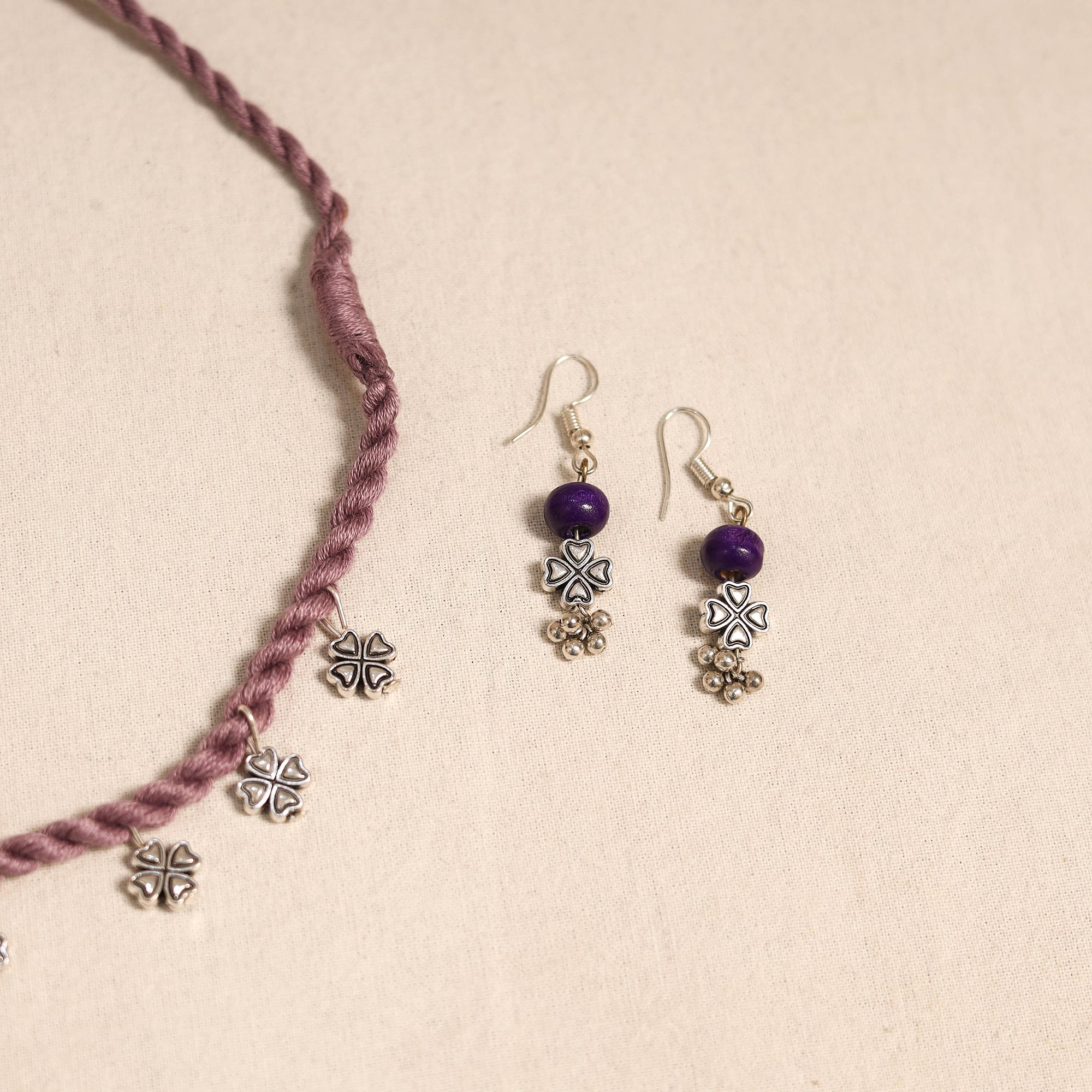 Elevate your ethnic look with this purple handcrafted necklace set featuring beautifully detailed german silver, paired with matching earrings. Strung on a soft thread, it offers both comfort and rustic elegance. Perfect for festive occasions, cultural gatherings, or simply adding a distinctive charm to your everyday style.
