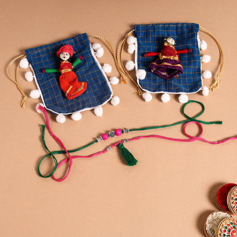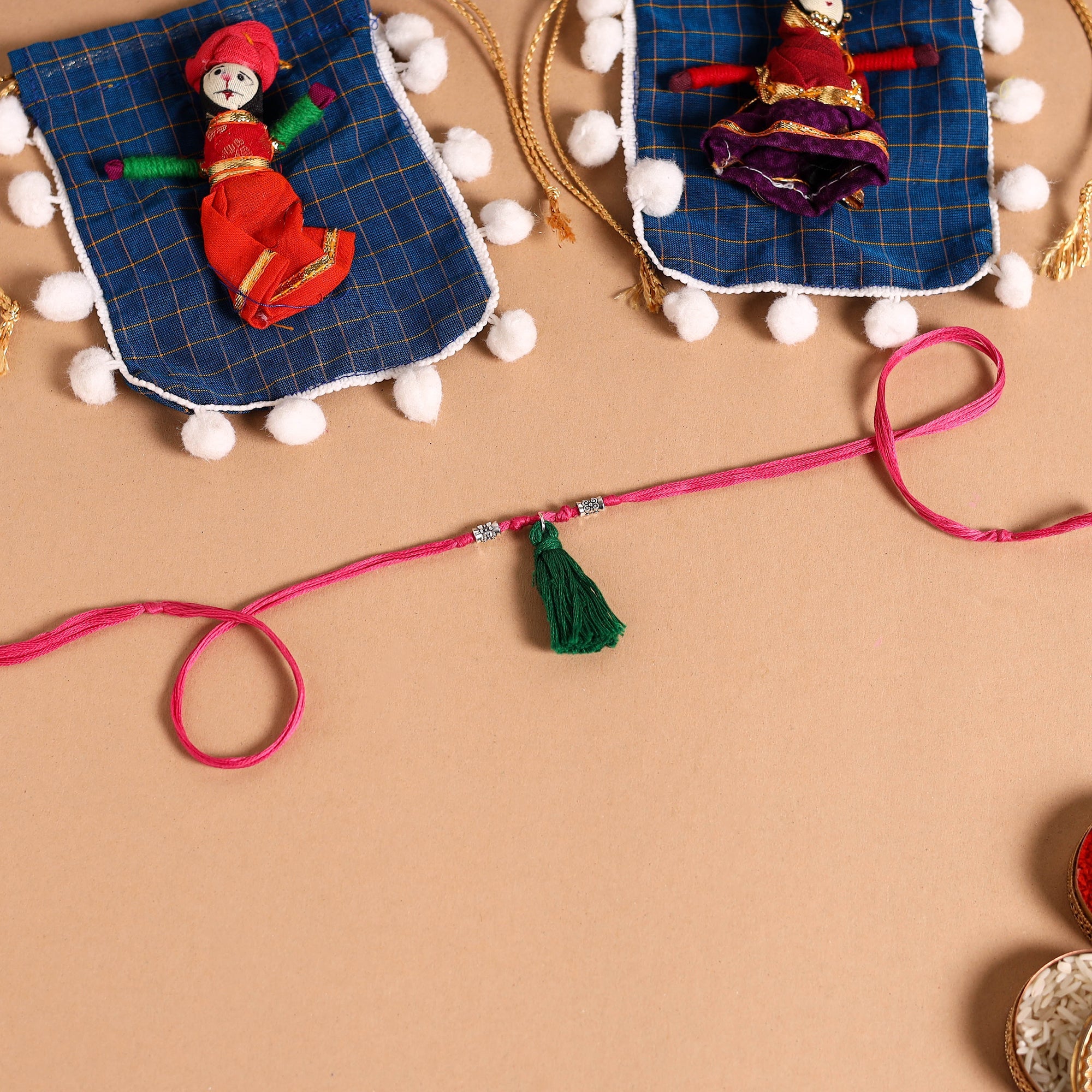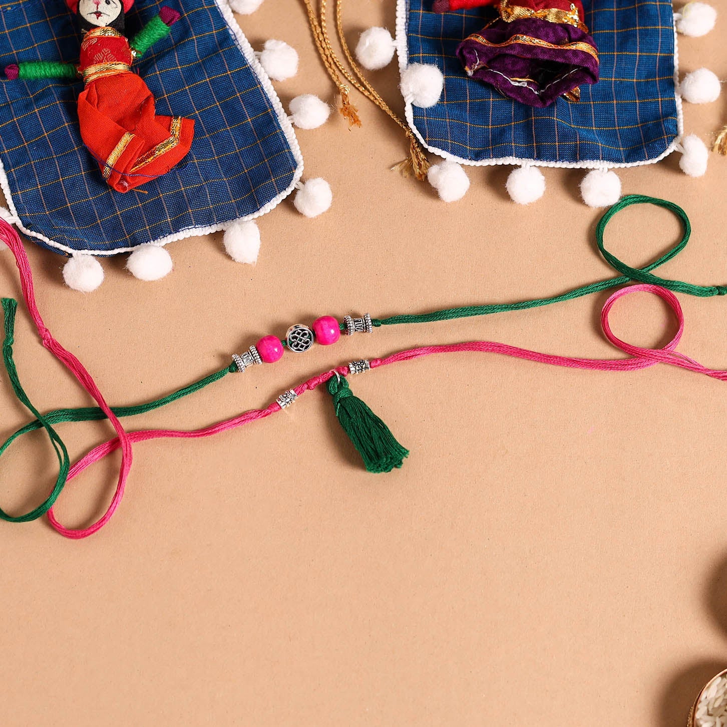 Celebrate the bond of love and tradition with this handmade german silver rakhi and lumba set. Crafted with vibrant colors and intricate patterns, this set beautifully symbolizes care, affection, and festive spirit. Perfect for Raksha Bandhan, it’s a meaningful way to express your love. The set includes a potli for gifting.