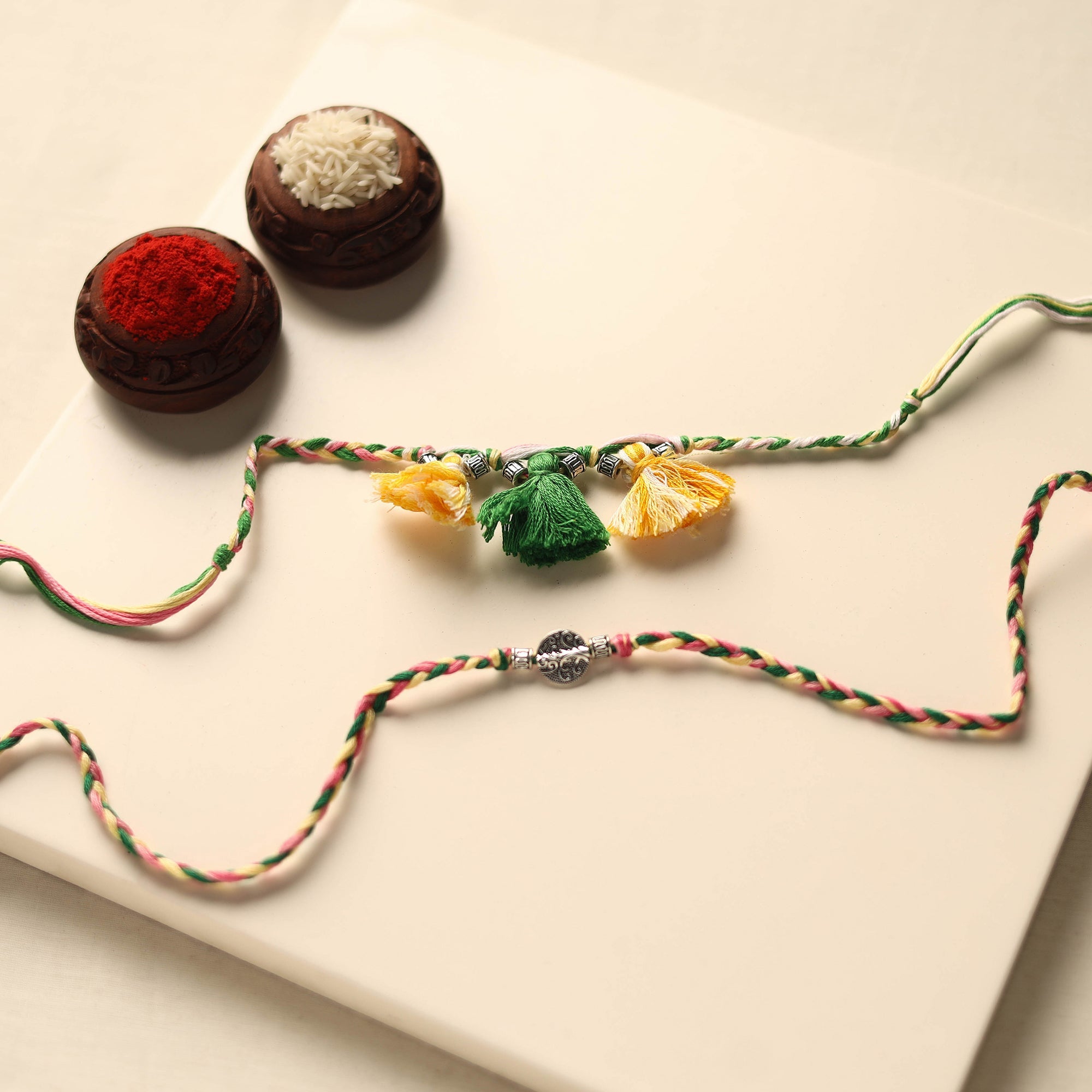 Rakhi can be made from materials such as silk thread, wool, satin ribbon, etc.