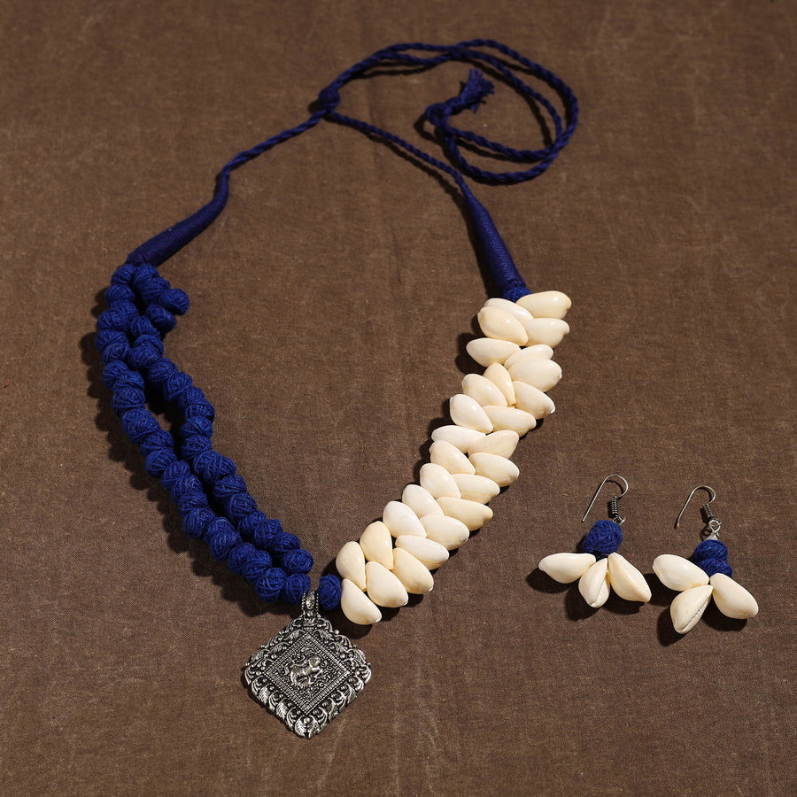Embrace the elegance of artisanal design with this multicolor handmade german silver shell necklace set. Created by skilled artisans, this necklace and earring set seamlessly blends tradition with contemporary elegance. Featuring thread beads and shells, the necklace is adorned with a striking German silver pendant, making it a unique addition to any ensemble.