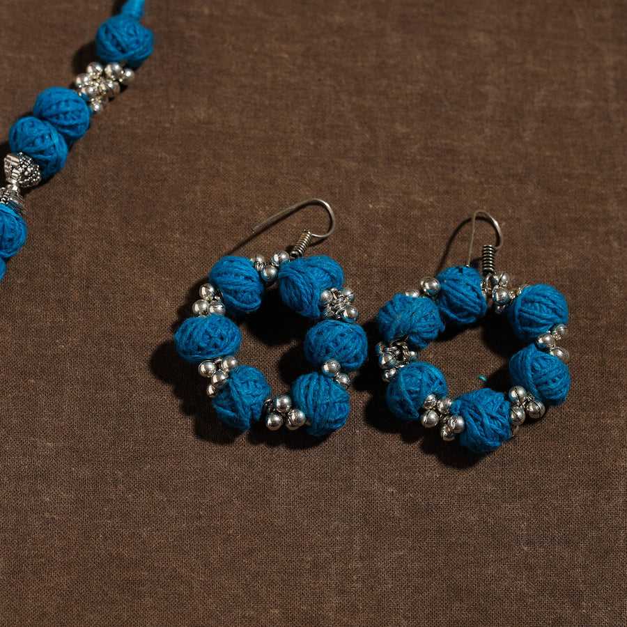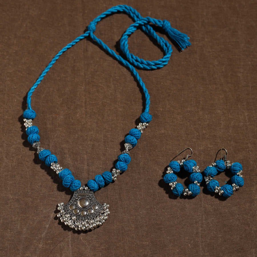 Embrace the elegance of artisanal design with this blue handmade german silver thread bead necklace set. Created by skilled artisans, this necklace and earring set seamlessly blend tradition with contemporary elegance. Featuring thread beads, the necklace is adorned with a striking German silver pendant, making it a unique addition to any ensemble.