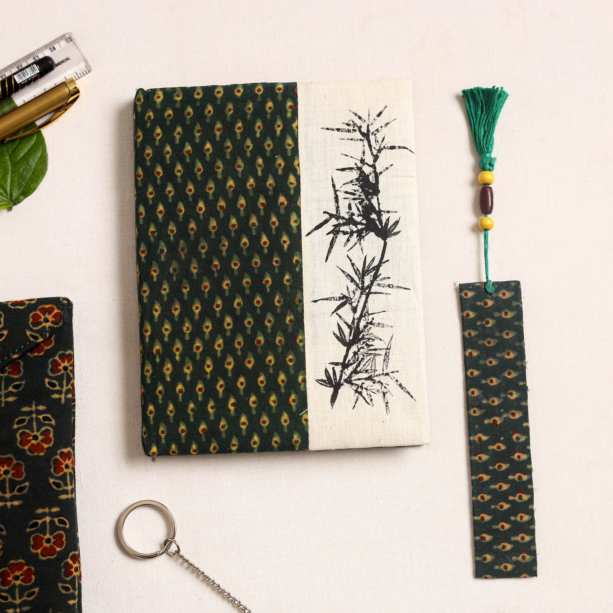 conscious leaf print, crafted to add charm to everyday essentials. The set includes a beautifully designed notebook with natural leaf print side panels and handmade paper, a matching bookmark adorned with wooden beads and tassels, a handcrafted keychain, and an pouch for stationery or gadgets. A perfect eco-friendly gifting choice that blends elegance with utility.