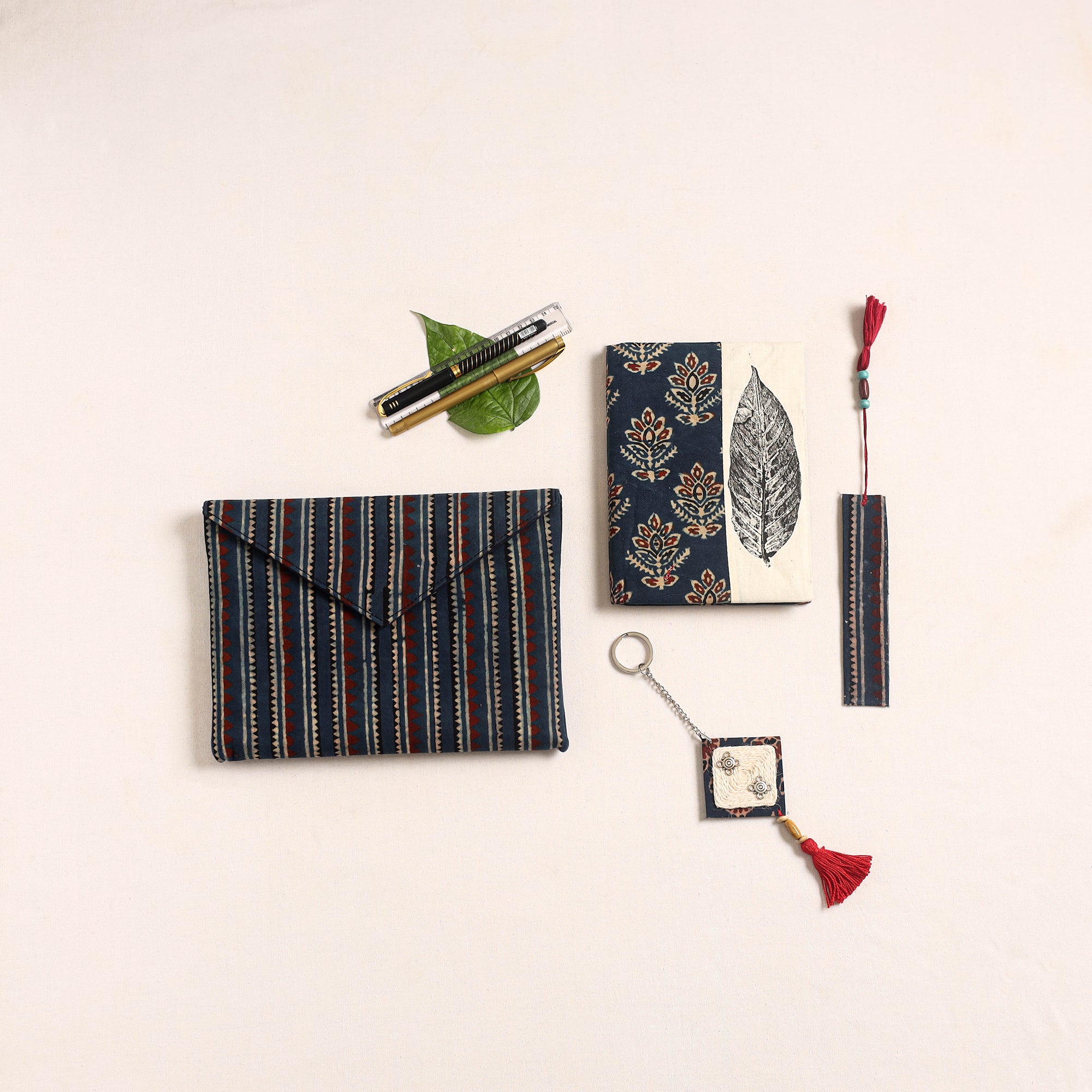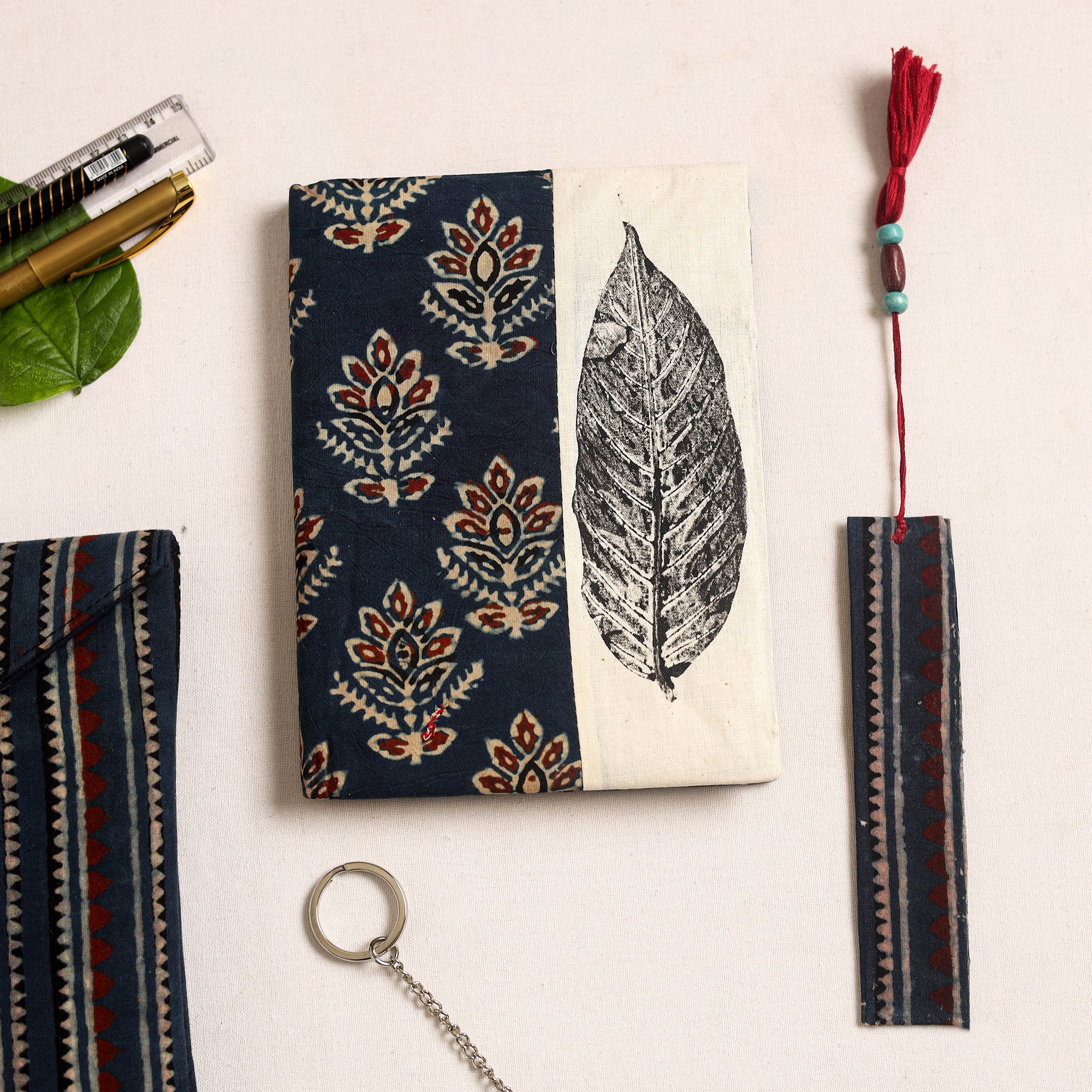 conscious leaf print, crafted to add charm to everyday essentials. The set includes a beautifully designed notebook with natural leaf print side panels and handmade paper, a matching bookmark adorned with wooden beads and tassels, a handcrafted keychain, and an pouch for stationery or gadgets. A perfect eco-friendly gifting choice that blends elegance with utility.