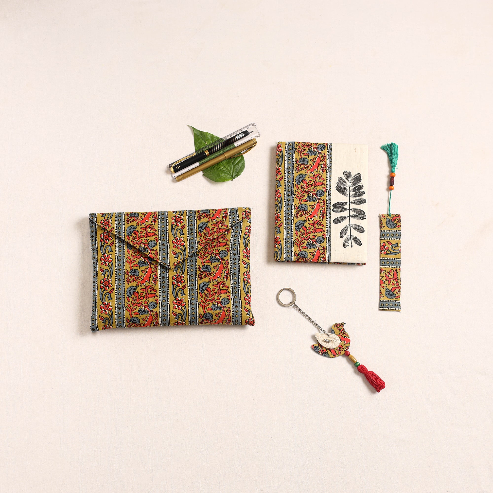 conscious leaf print, crafted to add charm to everyday essentials. The set includes a beautifully designed notebook with natural leaf print side panels and handmade paper, a matching bookmark adorned with wooden beads and tassels, a handcrafted keychain, and an pouch for stationery or gadgets. A perfect eco-friendly gifting choice that blends elegance with utility.
