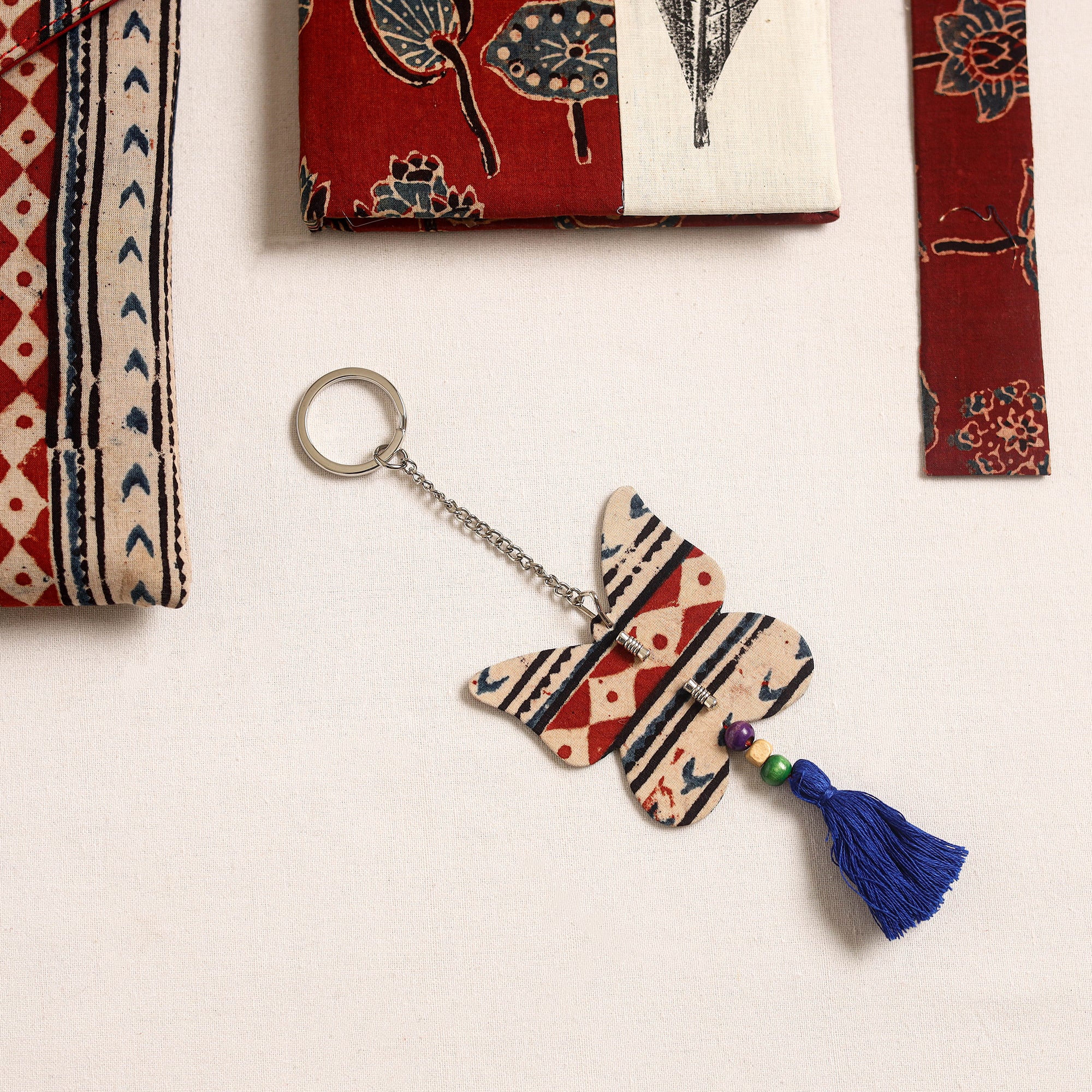 conscious leaf print, crafted to add charm to everyday essentials. The set includes a beautifully designed notebook with natural leaf print side panels and handmade paper, a matching bookmark adorned with wooden beads and tassels, a handcrafted keychain, and an pouch for stationery or gadgets. A perfect eco-friendly gifting choice that blends elegance with utility.