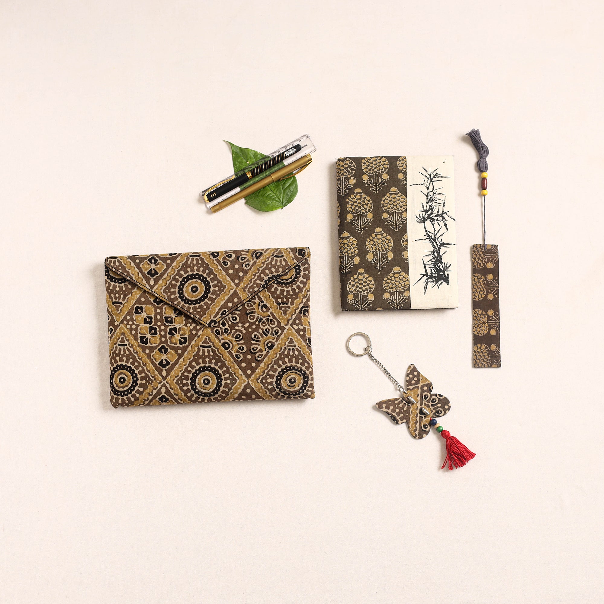 conscious leaf print, crafted to add charm to everyday essentials. The set includes a beautifully designed notebook with natural leaf print side panels and handmade paper, a matching bookmark adorned with wooden beads and tassels, a handcrafted keychain, and an pouch for stationery or gadgets. A perfect eco-friendly gifting choice that blends elegance with utility.