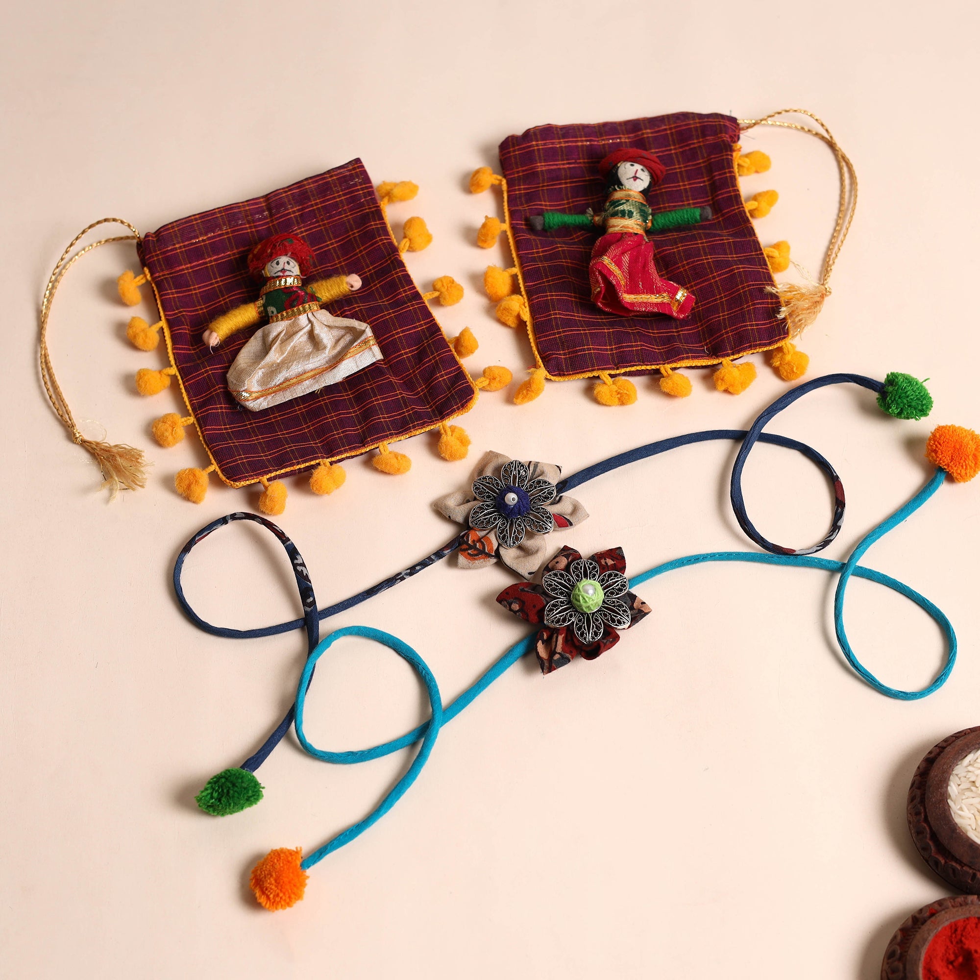 Celebrate the bond of love with this handmade GS fabric flower Rakhi set. Featuring intricate patterns and vibrant colors, this Rakhi adds a special touch to your celebration. The set includes a potli, making it a perfect gifting choice. Whether for a sibling or a loved one, this Rakhi beautifully symbolizes care and tradition. By Purchasing Rakhi from iTokri you have proudly associated yourself with our artisan support initiative which brings happiness to more than 10000 families across India. Thanks so much!