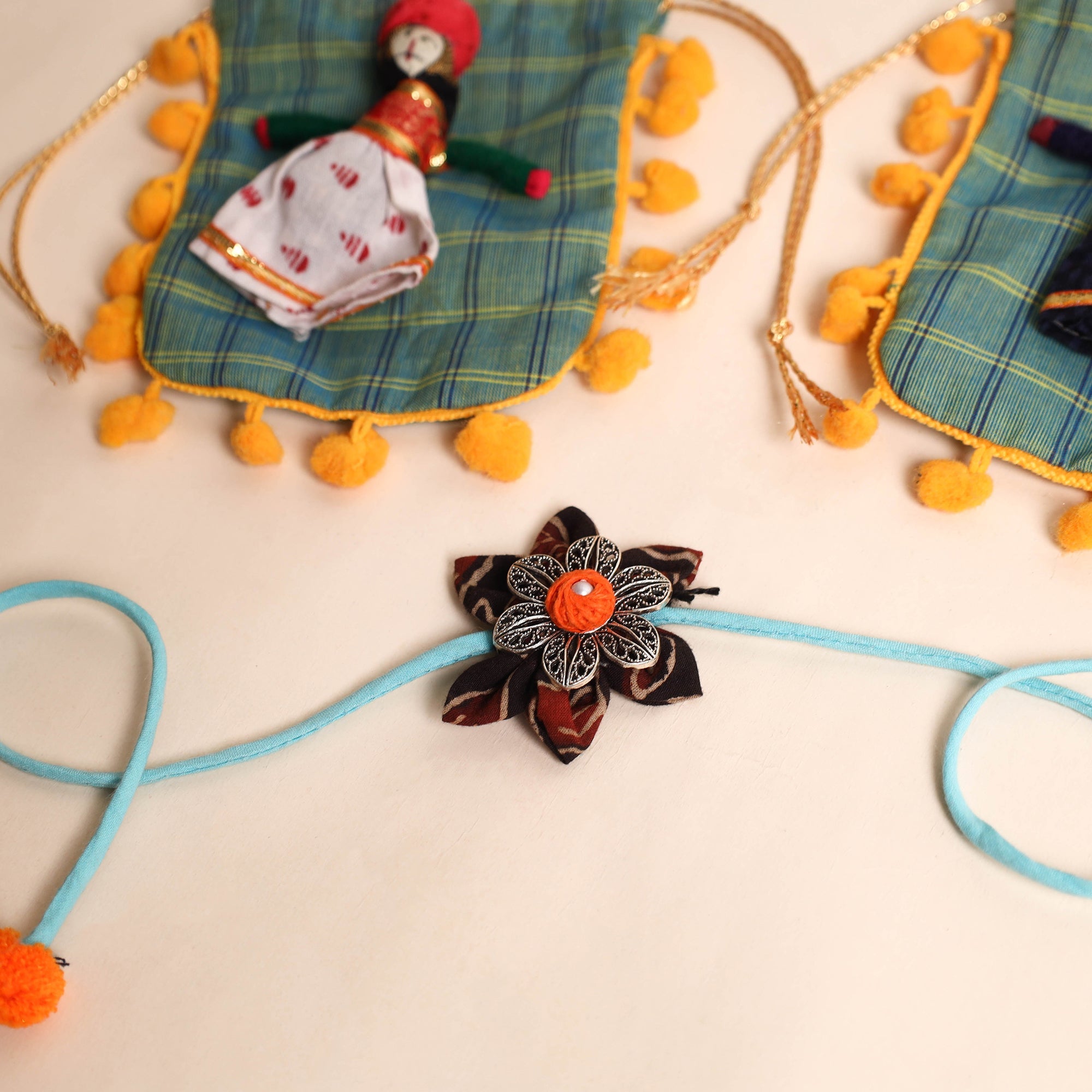 Celebrate the bond of love with this handmade GS fabric flower Rakhi set. Featuring intricate patterns and vibrant colors, this Rakhi adds a special touch to your celebration. The set includes a potli, making it a perfect gifting choice. Whether for a sibling or a loved one, this Rakhi beautifully symbolizes care and tradition. By Purchasing Rakhi from iTokri you have proudly associated yourself with our artisan support initiative which brings happiness to more than 10000 families across India. Thanks so much!