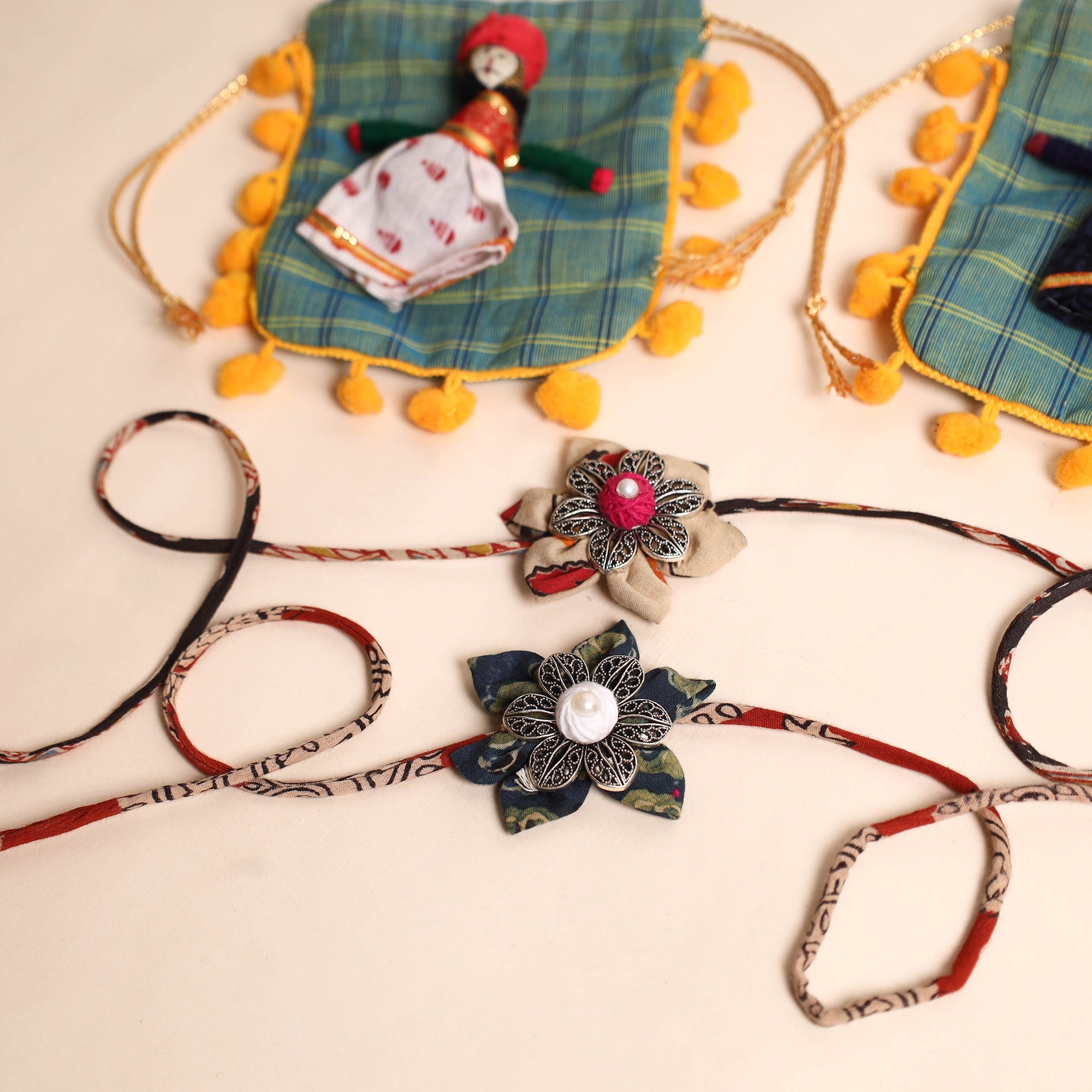 Celebrate the bond of love with this handmade GS fabric flower Rakhi set. Featuring intricate patterns and vibrant colors, this Rakhi adds a special touch to your celebration. The set includes a potli, making it a perfect gifting choice. Whether for a sibling or a loved one, this Rakhi beautifully symbolizes care and tradition. By Purchasing Rakhi from iTokri you have proudly associated yourself with our artisan support initiative which brings happiness to more than 10000 families across India. Thanks so much!