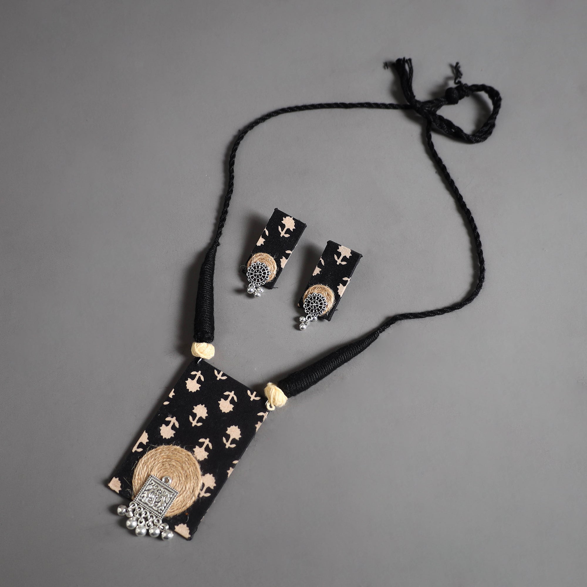 Add a touch of elegance to your look with this handmade gs black jute fabart necklace set. Designed by skilled artisans, this necklace and earring set blends traditional craftsmanship with a modern touch. Made with thread, the necklace features a fabric pendant beautifully adorned with jute and German silver elements. Perfect for adding a unique charm to any outfit.