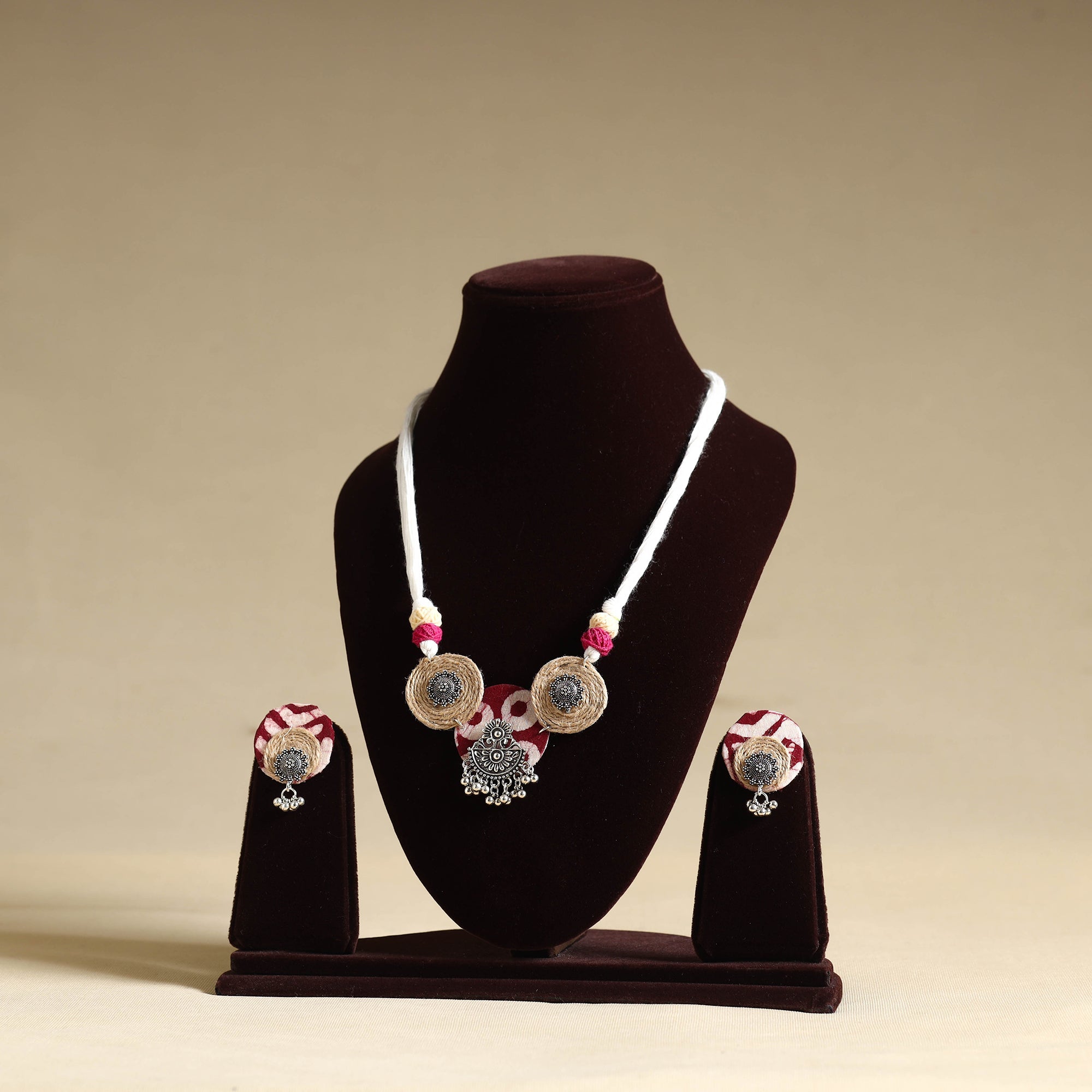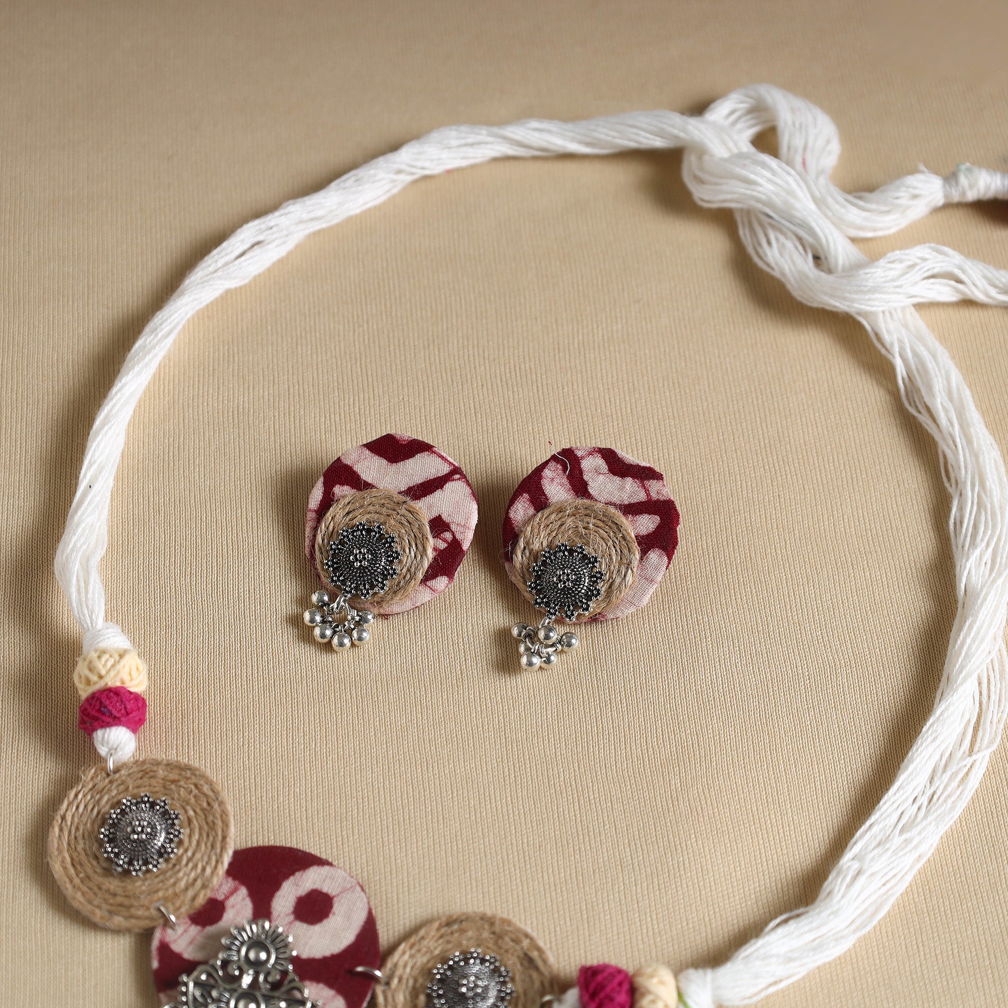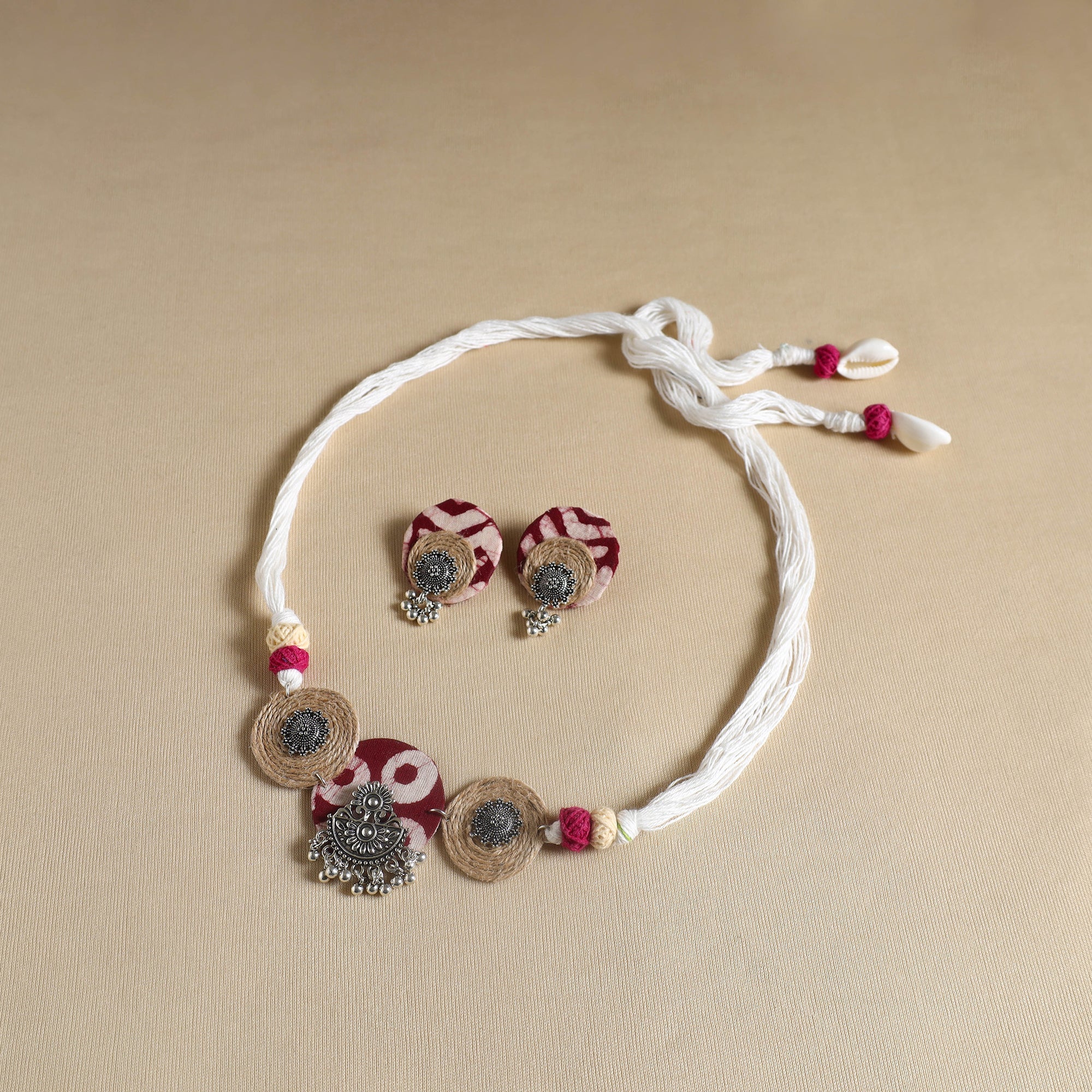 Transform your look with this handmade GS Jute white fabart necklace set. Designed by skilled artisans, this set combines traditional craftsmanship with a modern touch. Crafted using thread, the necklace features a fabric pendant beautifully adorned with jute and german silver elements. This necklace set for women is perfect for any occasion, offering both style and sophistication.