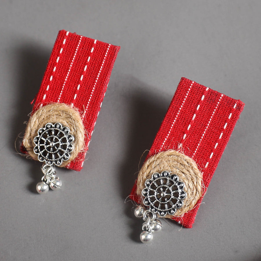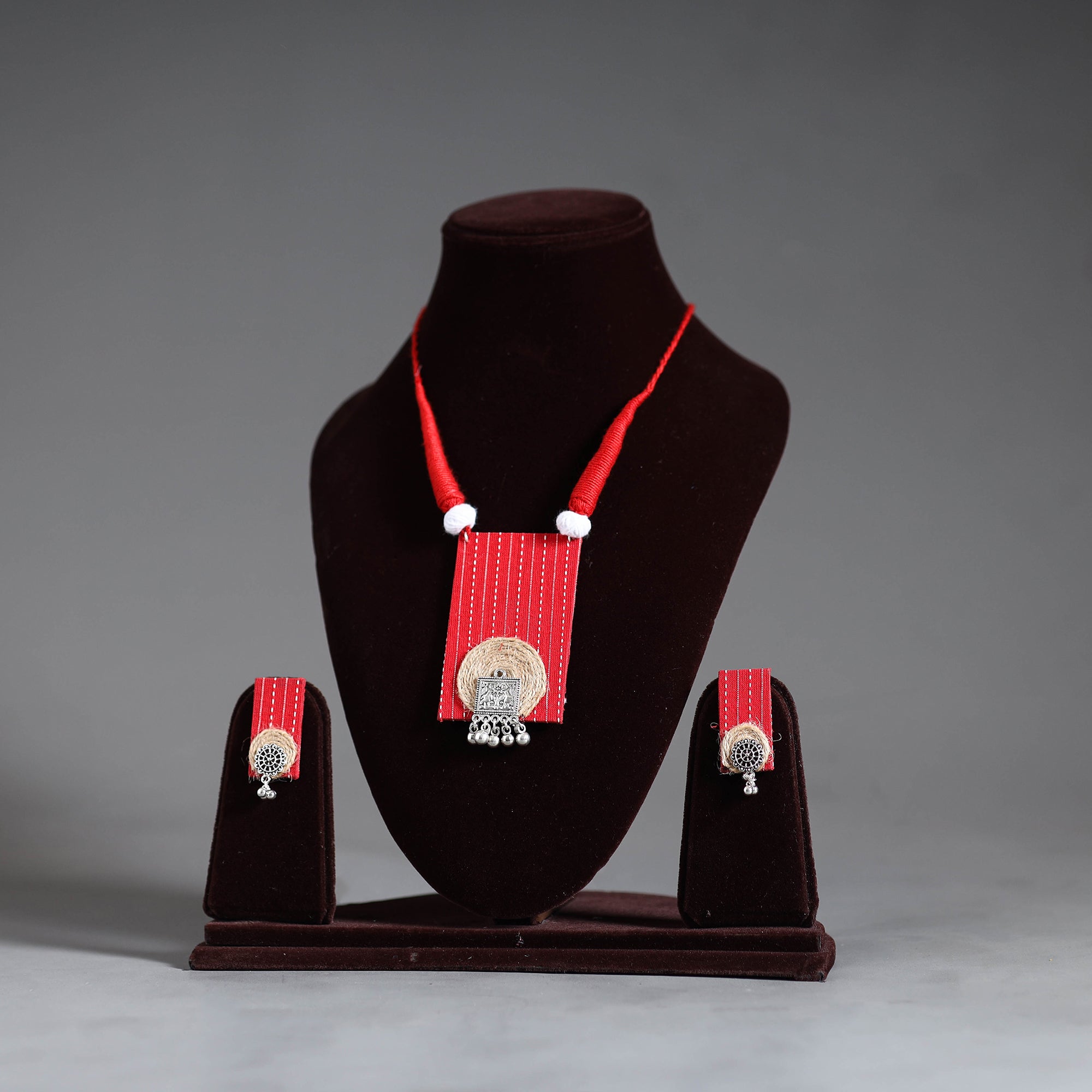 Add a touch of elegance to your look with this red handmade gs jute fabart necklace set. Designed by skilled artisans, this necklace and earring set blends traditional craftsmanship with a modern touch. Made with thread, the necklace features a fabric pendant beautifully adorned with jute and German silver elements. Perfect for adding a unique charm to any outfit.