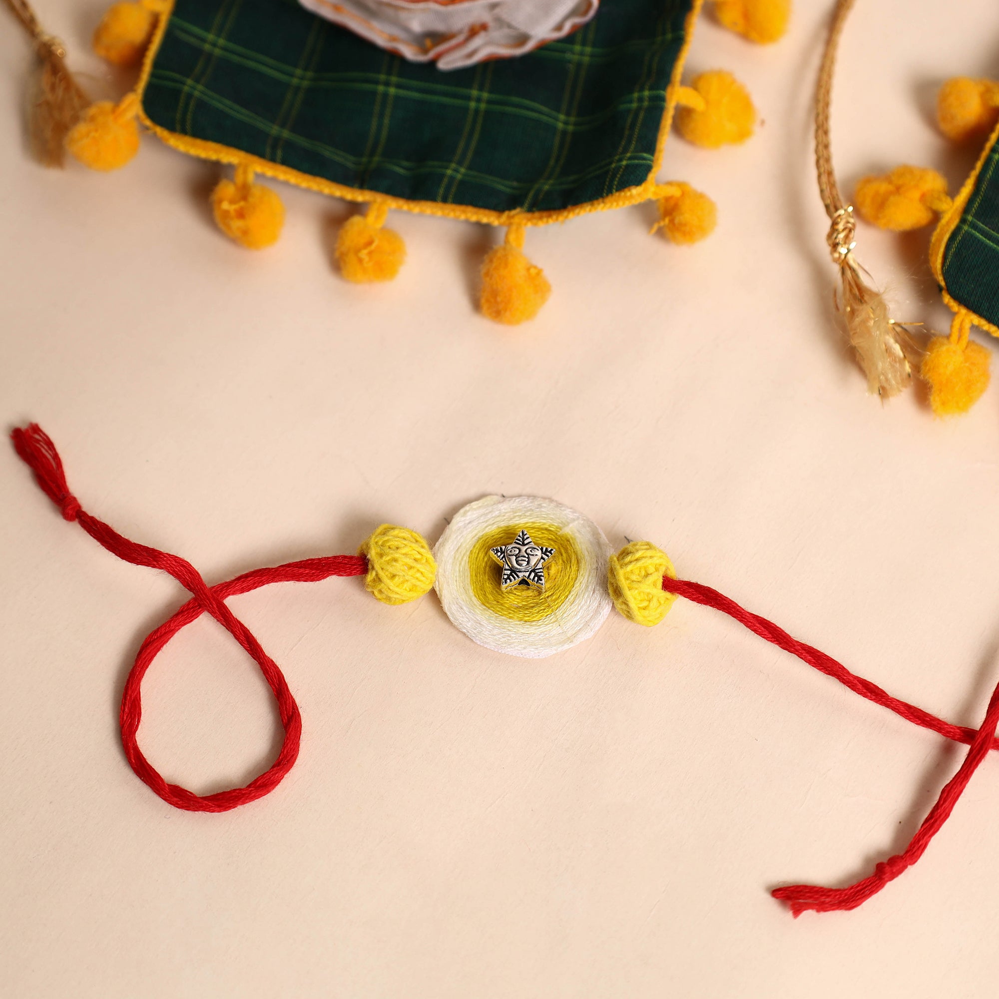 Celebrate the joyous festival of raksha bandhan with our exquisite handmade jute rakhi. Skillfully handcrafted with intricate designs, this rakhi is a true symbol of love and affection between brother and sister. It comes with a charming potli for an added touch of elegance.