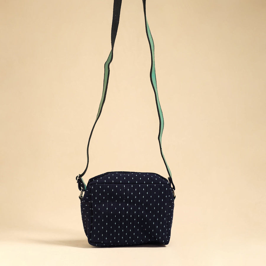 This blue handmade jacquard cotton sling bag features a leather pocket on the outside with a secure magnetic closure. Designed for convenience, it comes with an adjustable strap for a comfortable fit. Lightweight yet durable, this bag is perfect for carrying essentials while adding a stylish touch to your everyday look.