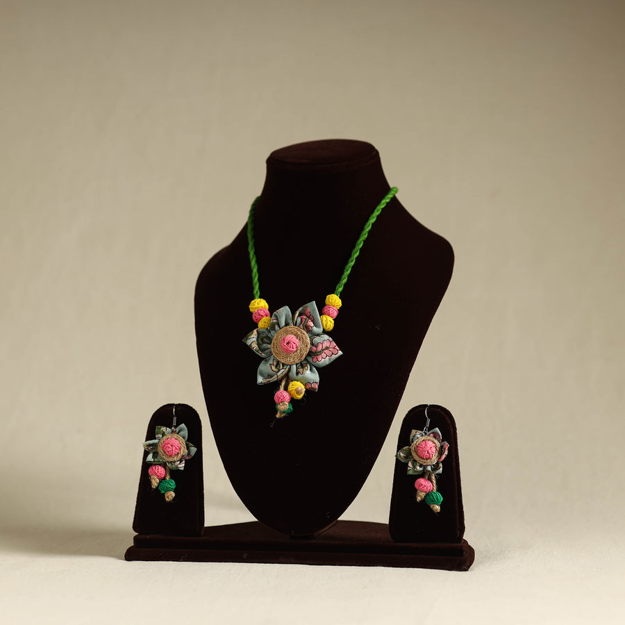 Elevate your jewelry collection with this artisan-crafted jute multicolor fabart necklace set. Featuring a thread necklace and coordinating earrings with a fabric pendant, it’s beautifully detailed with delicate jute work. Ideal for adding charm to your casual looks, festive attire, or handmade outfits.