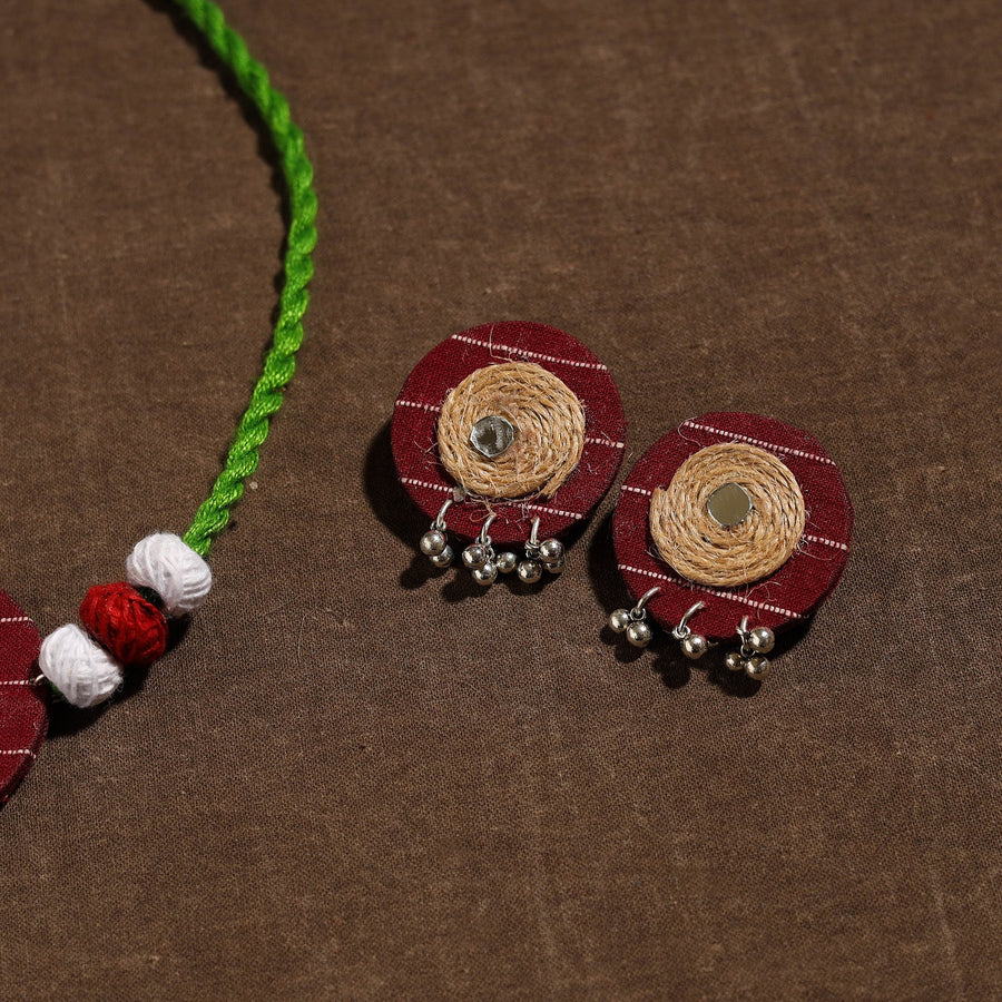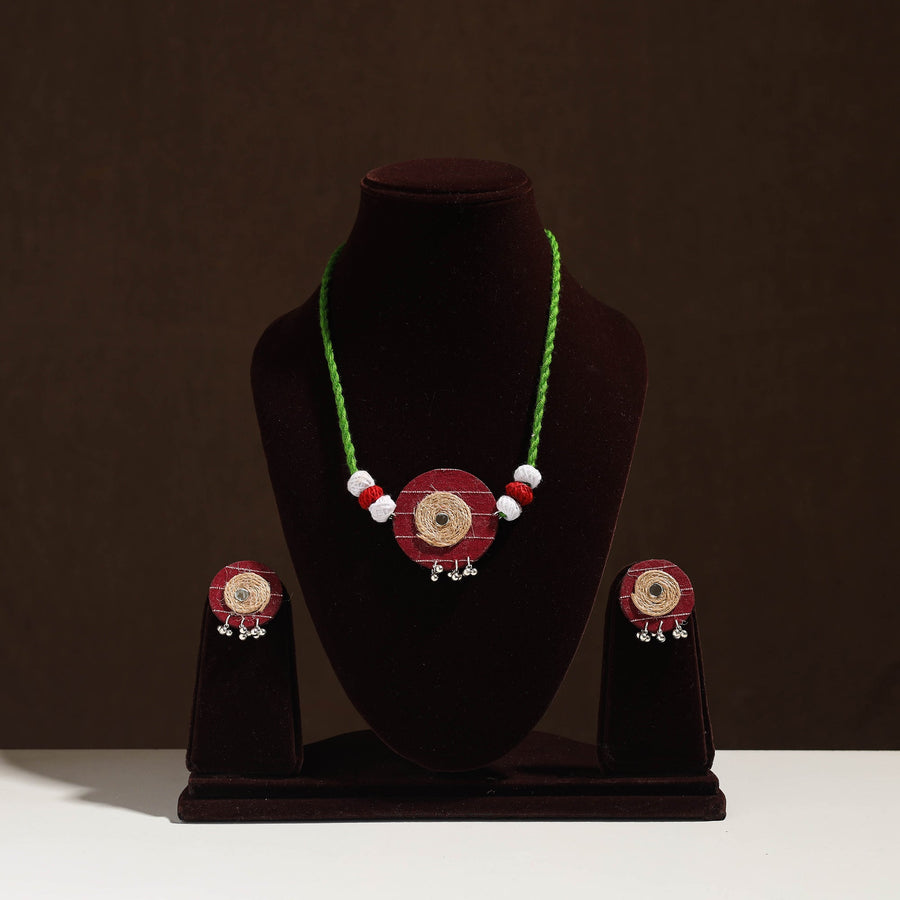 Embrace the elegance of artisanal design with this handcrafted jute green fabart necklace set. Created by skilled artisans, this necklace and earring set seamlessly blends tradition with contemporary elegance. Made with thread, the necklace features a fabric pendant beautifully adorned with jute and mirror work elements, making it a perfect addition to any outfit.