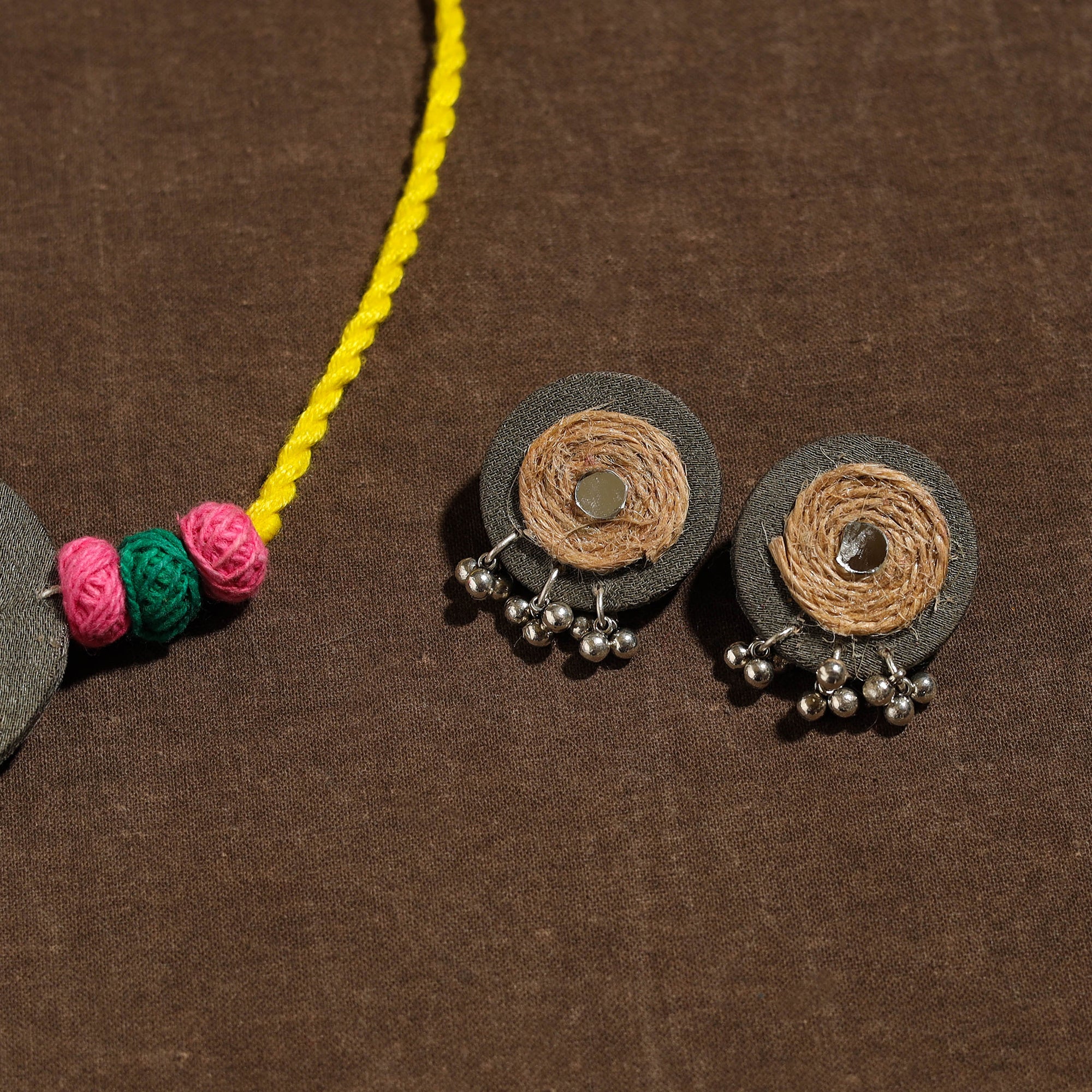 Embrace the elegance of artisanal design with this handcrafted jute yellow fabart necklace set. Created by skilled artisans, this necklace and earring set seamlessly blends tradition with contemporary elegance. Made with thread, the necklace features a fabric pendant beautifully adorned with jute and mirror work elements, making it a perfect addition to any outfit.