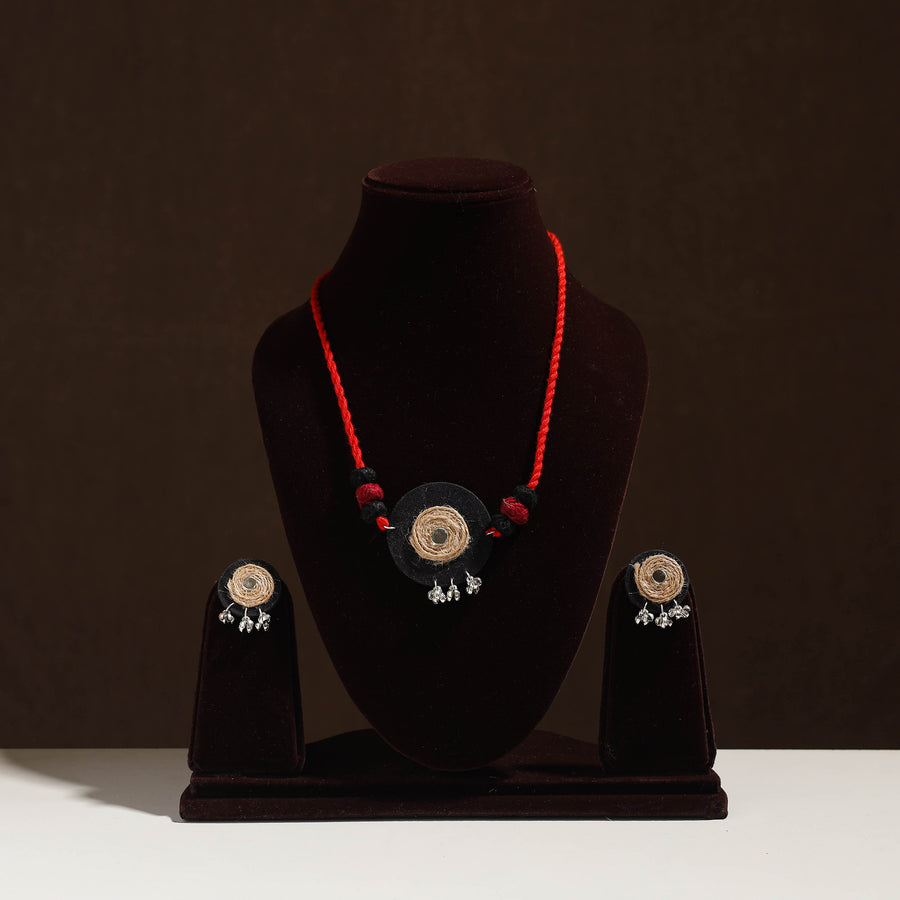 Embrace the elegance of artisanal design with this multicolor handcrafted jute fabart necklace set. Created by skilled artisans, this necklace and earring set seamlessly blends tradition with contemporary elegance. Made with thread, the necklace features a fabric pendant beautifully adorned with jute and mirror work elements, making it a perfect addition to any outfit.