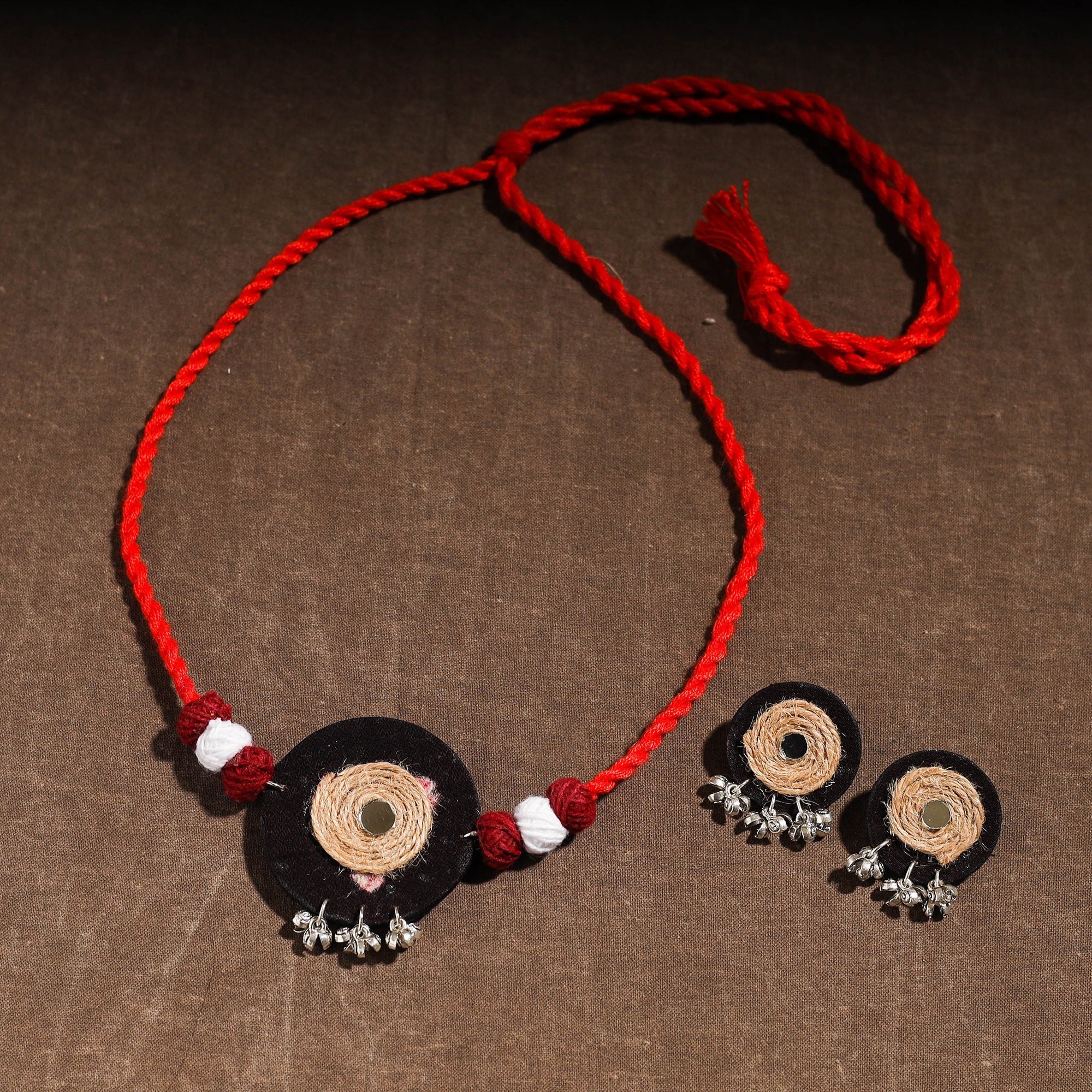 Embrace the elegance of artisanal design with this handcrafted jute red fabart necklace set. Created by skilled artisans, this necklace and earring set seamlessly blends tradition with contemporary elegance. Made with thread, the necklace features a fabric pendant beautifully adorned with jute and mirror work elements, making it a perfect addition to any outfit.