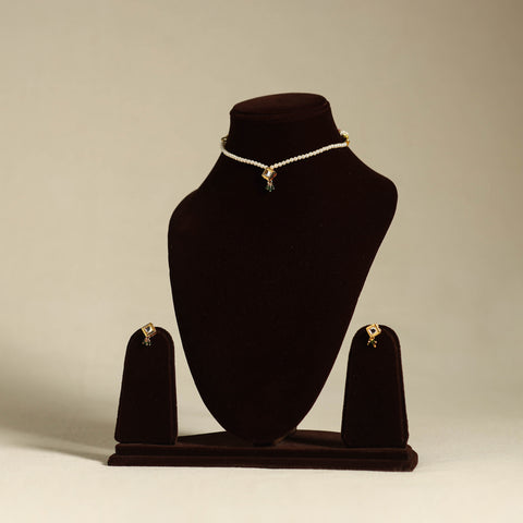 Add a unique charm to your look with this white handmade reversible choker necklace set, paired with matching earrings. Crafted by skilled artisans using traditional techniques, this set showcases intricate kundan detailing, making it a perfect choice to add elegance and style to any outfit.