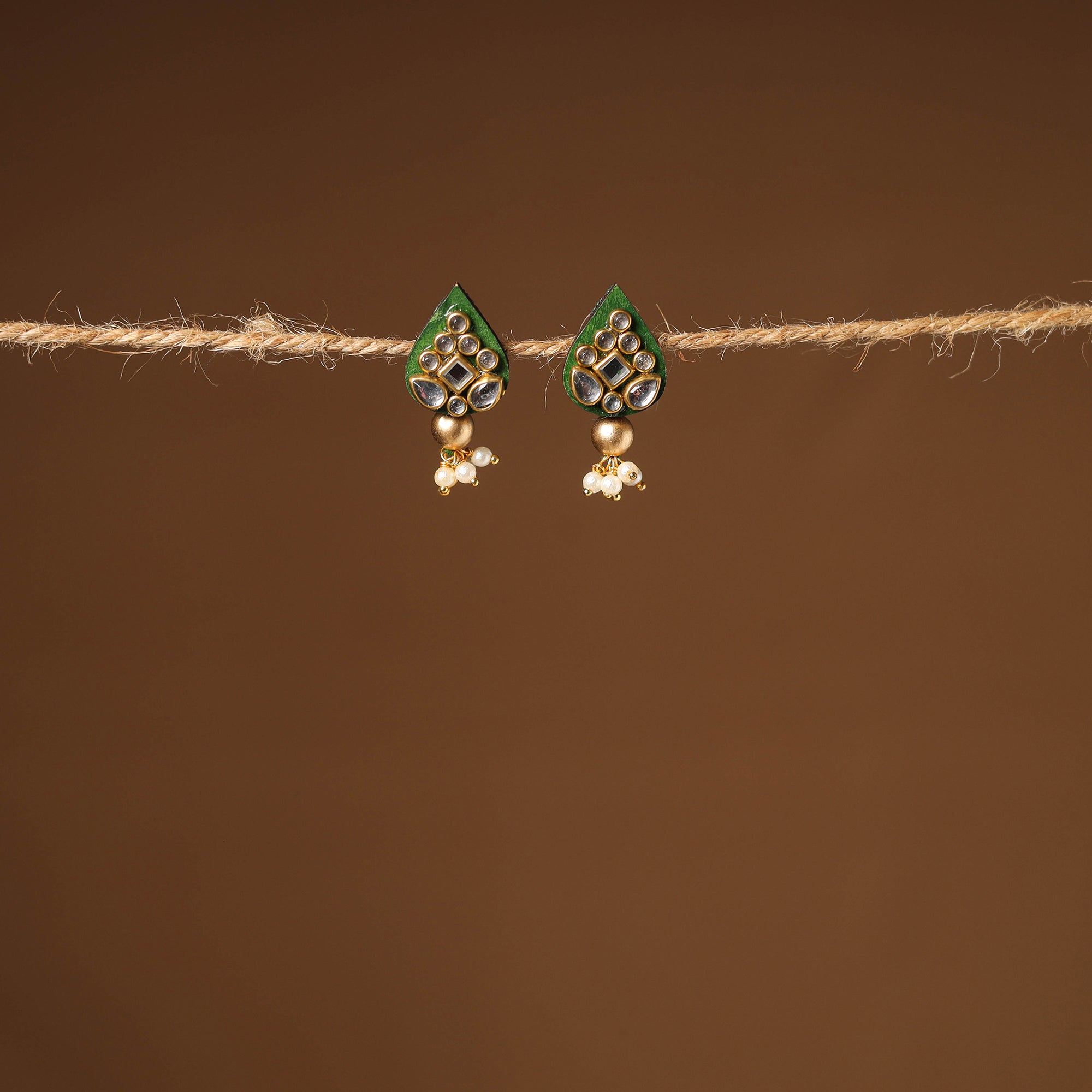 Add charm to your style with this green handcrafted kundan work earrings, crafted by skilled artisans using traditional techniques. This piece beautifully blends heritage jewellery design with a modern twist, making it perfect for festive occasions and everyday elegance.