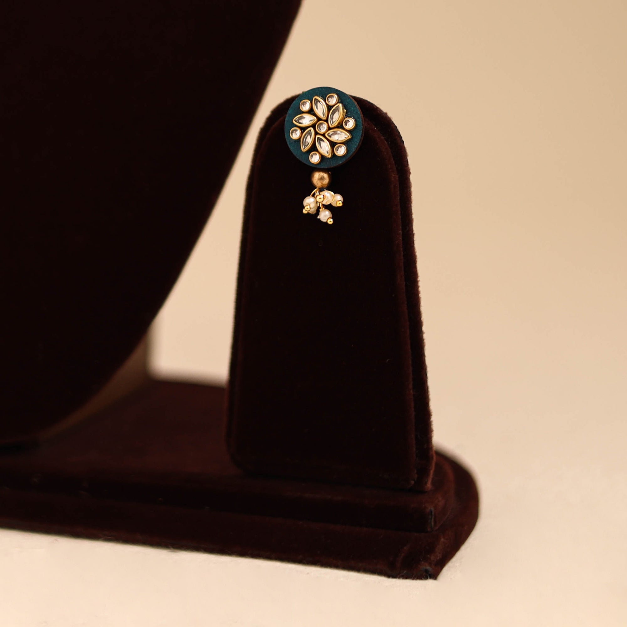 This green kundan work necklace set is crafted on a sturdy wood base, featuring intricate kundan and bead detailing. It comes with a beautifully designed necklace and matching earrings, perfect for weddings, parties, or festive occasions. The unique wooden base enhances its appeal, while the elegant design pairs effortlessly with traditional outfits, adding graceful charm to your overall look.