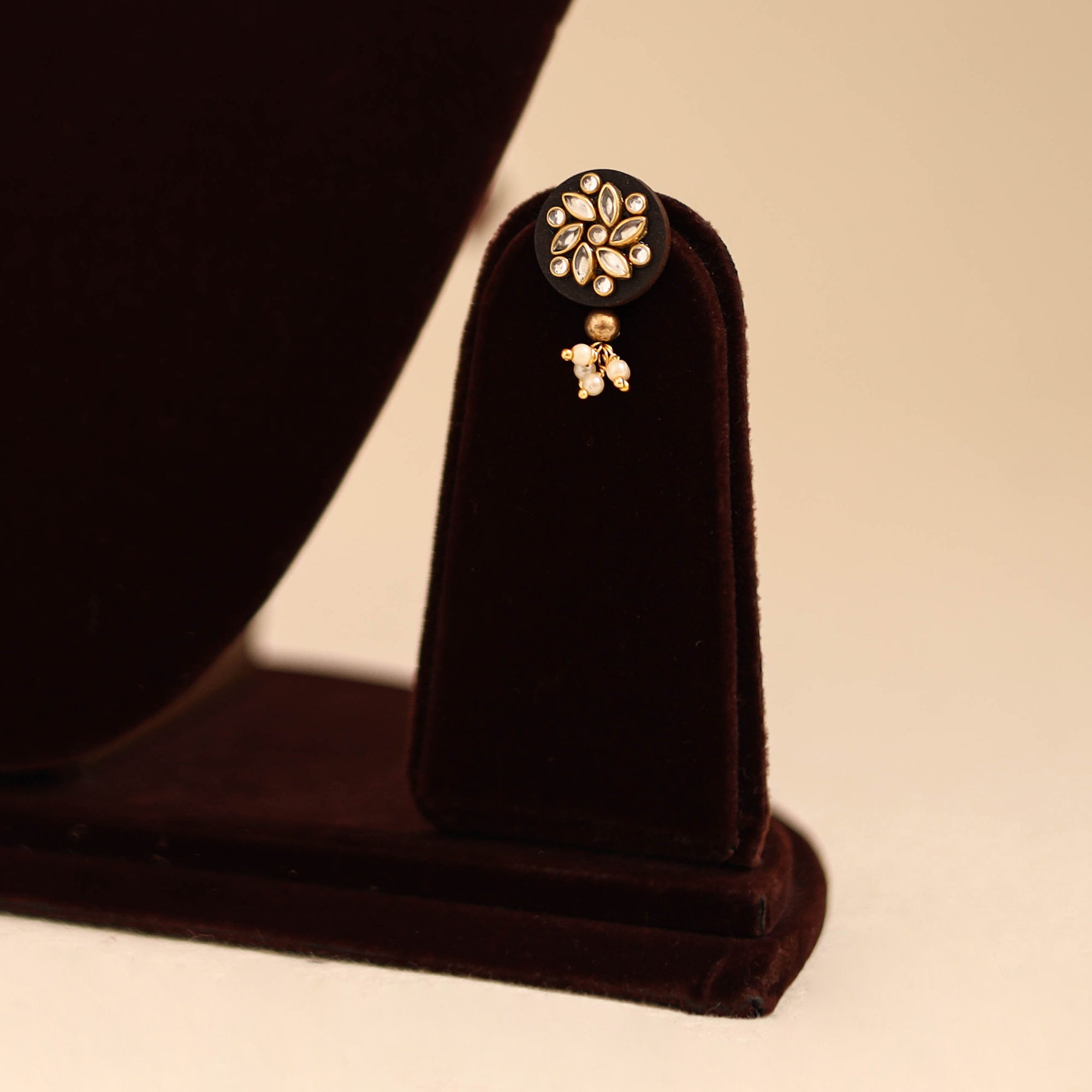 This white kundan work necklace set is crafted on a sturdy wood base, featuring intricate kundan and bead detailing. It comes with a beautifully designed necklace and matching earrings, perfect for weddings, parties, or festive occasions. The unique wooden base enhances its appeal, while the elegant design pairs effortlessly with traditional outfits, adding graceful charm to your overall look.