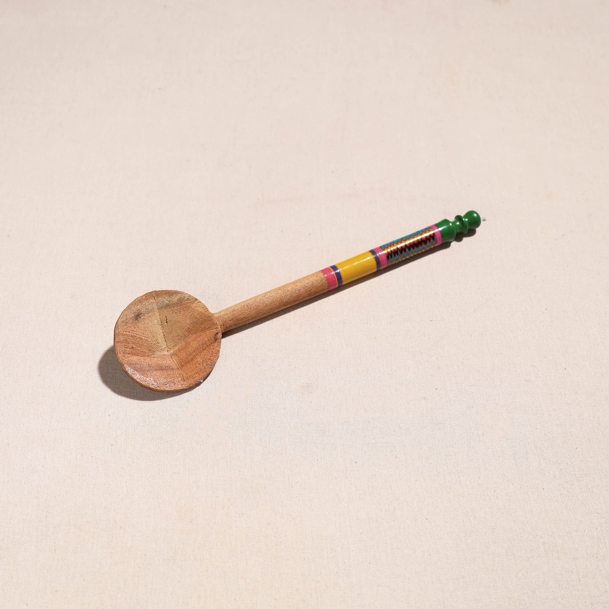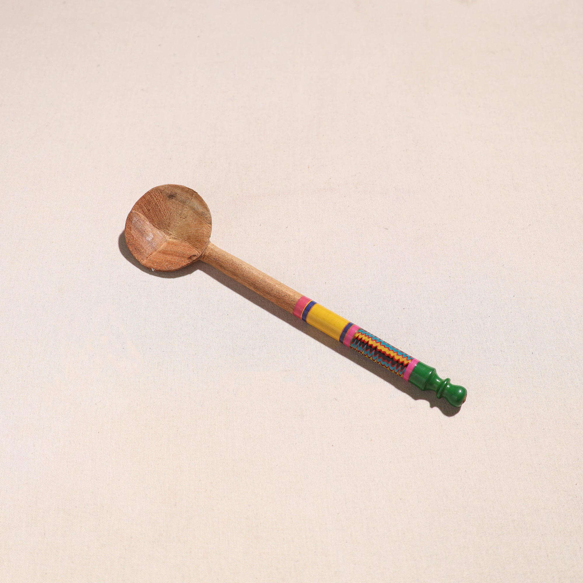 This handcrafted wooden ladle spoon, is made of babool wood with lacquered colors. This ladle spoon is meticulously handcrafted by skilled artisans from the Vadha community in villages like Nirona and Jura. They begin by selecting babool wood, which is known for its durability and strength. Layers of colored lacquer are applied to the wood, and intricate designs and effects are chiseled to create a stunning visual appealHandmade lacquered wooden ladle spoon (12 in) 31