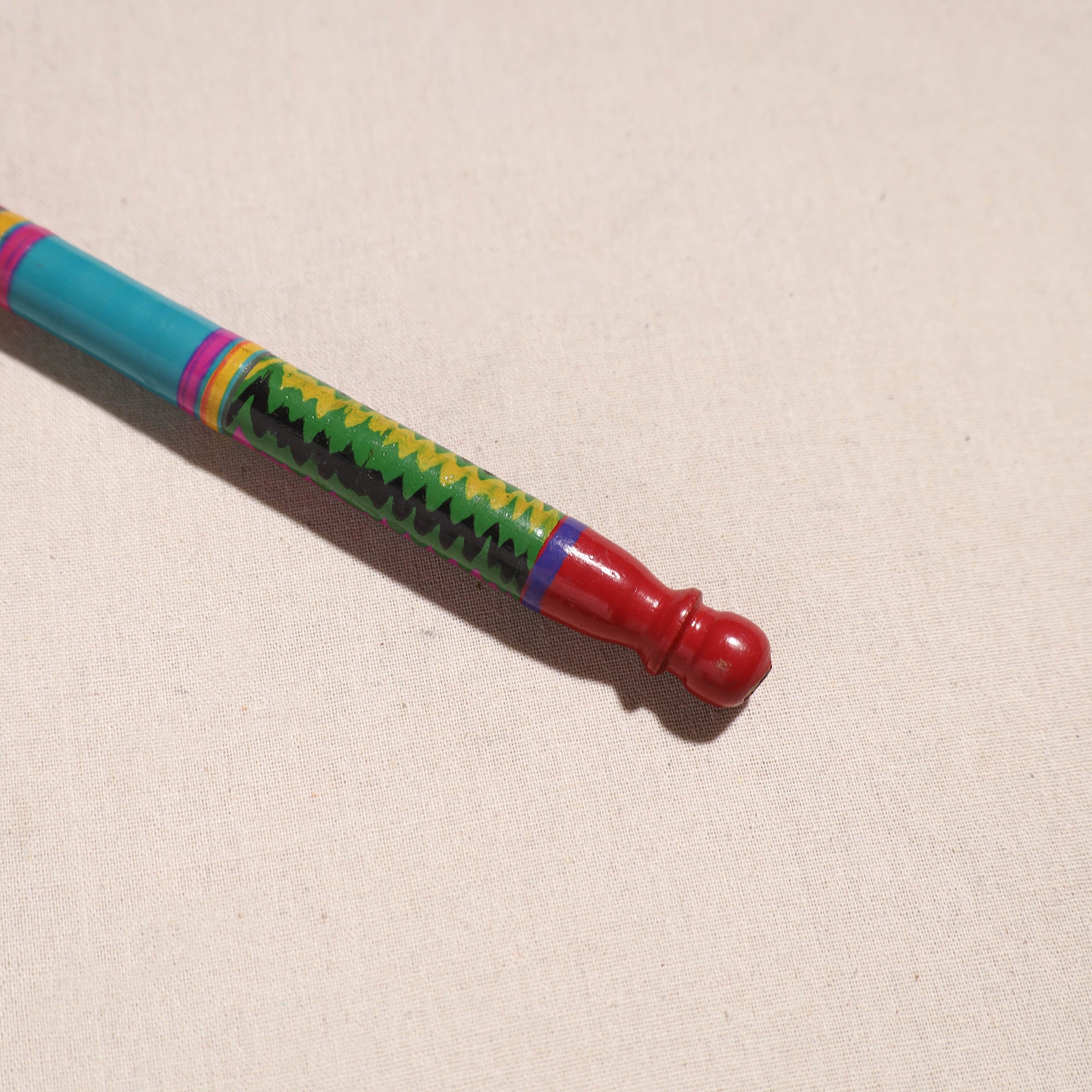 This handcrafted wooden ladle spoon, is made of babool wood with lacquered colors. This ladle spoon is meticulously handcrafted by skilled artisans from the Vadha community in villages like Nirona and Jura. They begin by selecting babool wood, which is known for its durability and strength. Layers of colored lacquer are applied to the wood, and intricate designs and effects are chiseled to create a stunning visual appeal
