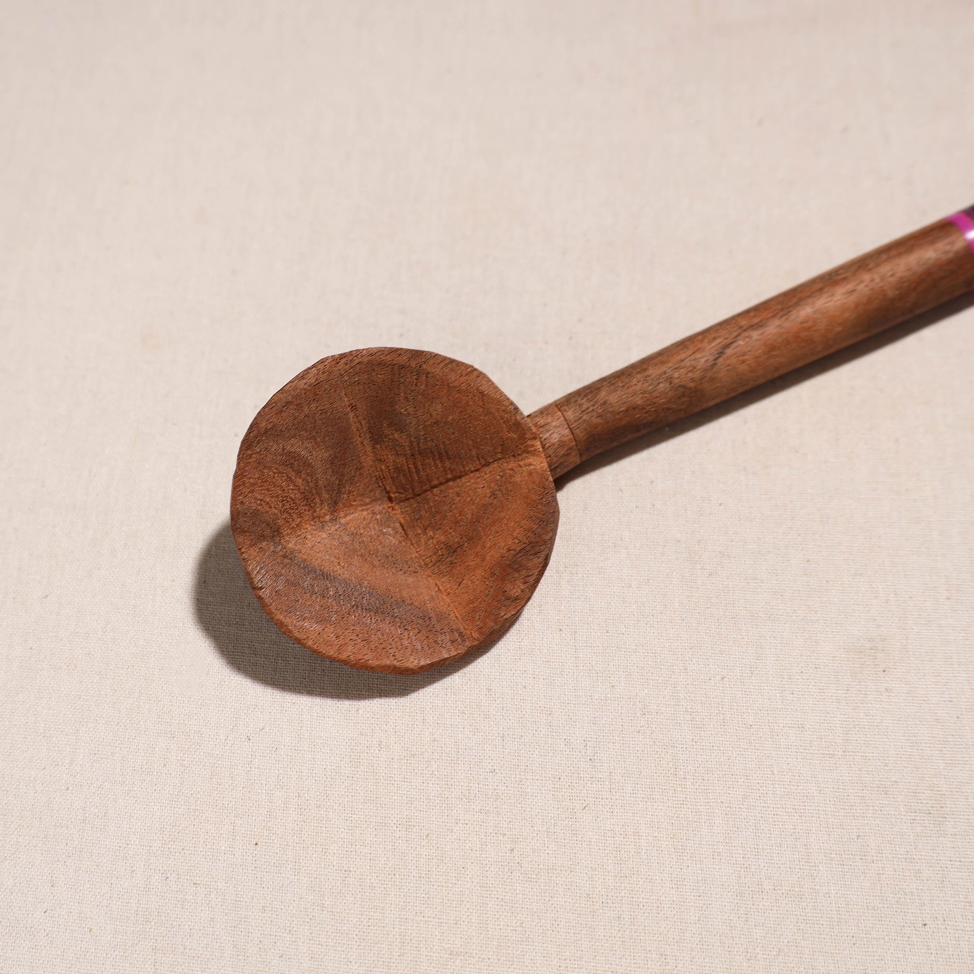 This handcrafted wooden ladle spoon, is made of babool wood with lacquered colors. This ladle spoon is meticulously handcrafted by skilled artisans from the Vadha community in villages like Nirona and Jura. They begin by selecting babool wood, which is known for its durability and strength. Layers of colored lacquer are applied to the wood, and intricate designs and effects are chiseled to create a stunning visual appeal