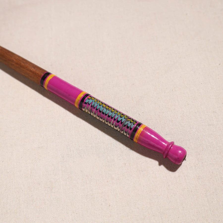 This handcrafted wooden ladle spoon, is made of babool wood with lacquered colors. This ladle spoon is meticulously handcrafted by skilled artisans from the Vadha community in villages like Nirona and Jura. They begin by selecting babool wood, which is known for its durability and strength. Layers of colored lacquer are applied to the wood, and intricate designs and effects are chiseled to create a stunning visual appeal