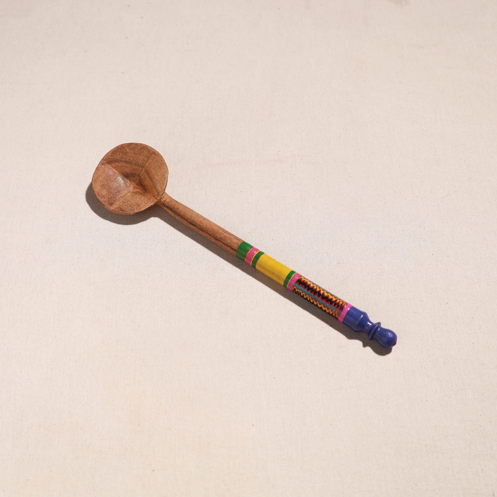 This handcrafted wooden ladle spoon, is made of babool wood with lacquered colors. This ladle spoon is meticulously handcrafted by skilled artisans from the Vadha community in villages like Nirona and Jura. They begin by selecting babool wood, which is known for its durability and strength. Layers of colored lacquer are applied to the wood, and intricate designs and effects are chiseled to create a stunning visual appeal