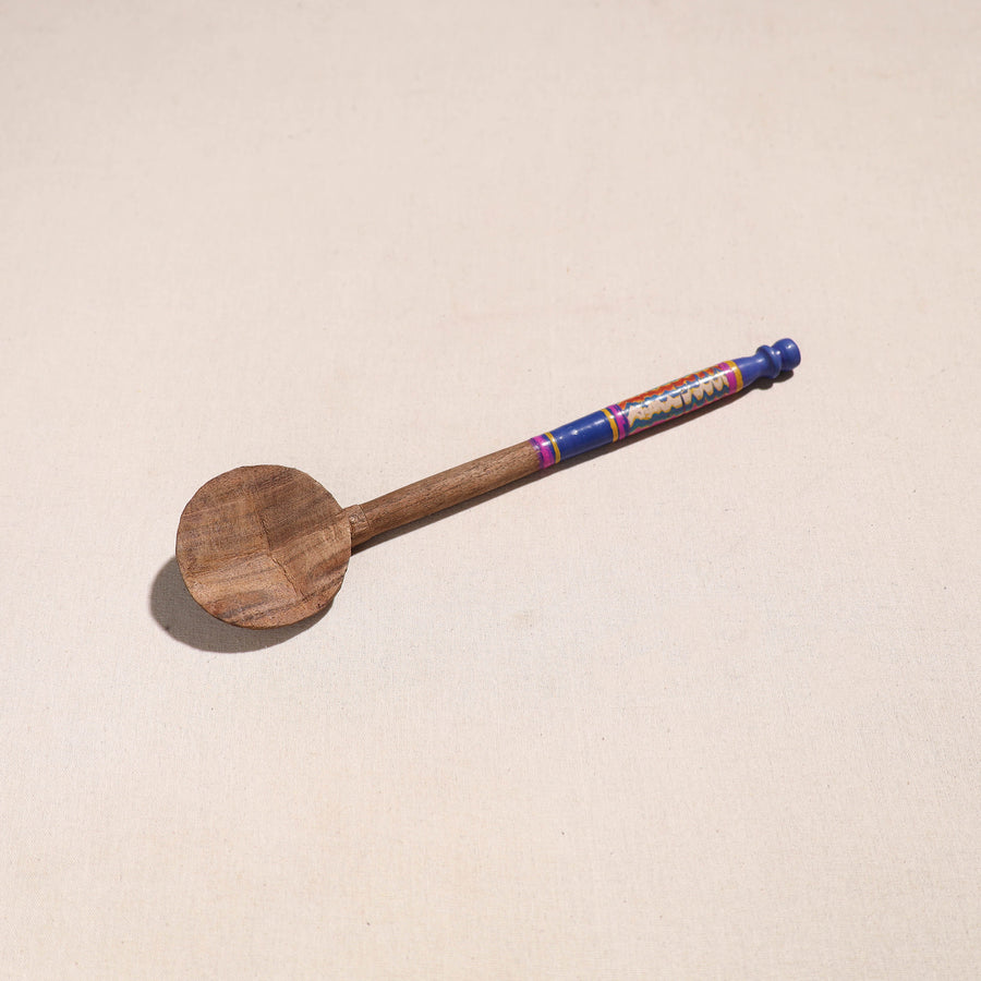 This handcrafted wooden ladle spoon, is made of babool wood with lacquered colors. This ladle spoon is meticulously handcrafted by skilled artisans from the Vadha community in villages like Nirona and Jura. They begin by selecting babool wood, which is known for its durability and strength. Layers of colored lacquer are applied to the wood, and intricate designs and effects are chiseled to create a stunning visual appeal