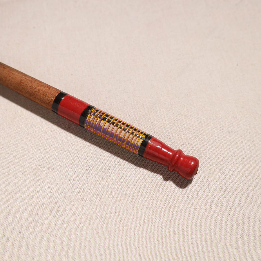 This handcrafted wooden ladle spoon, is made of babool wood with lacquered colors. This ladle spoon is meticulously handcrafted by skilled artisans from the Vadha community in villages like Nirona and Jura. They begin by selecting babool wood, which is known for its durability and strength. Layers of colored lacquer are applied to the wood, and intricate designs and effects are chiseled to create a stunning visual appeal
