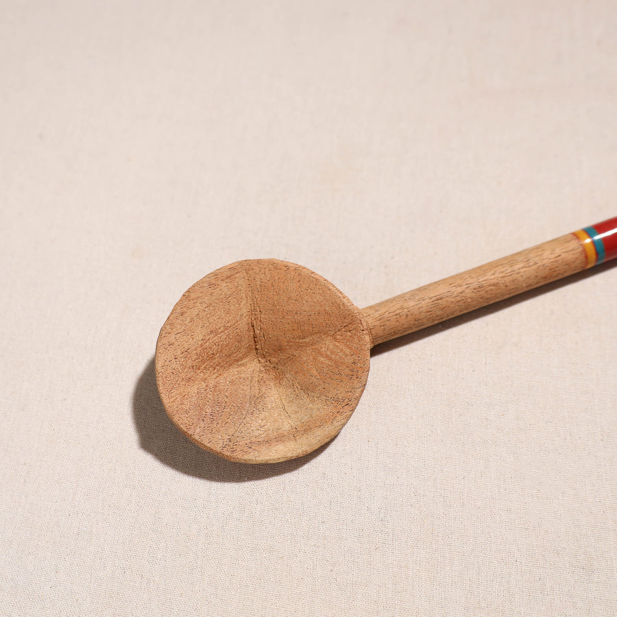 This handcrafted wooden ladle spoon, is made of babool wood with lacquered colors. This ladle spoon is meticulously handcrafted by skilled artisans from the Vadha community in villages like Nirona and Jura. They begin by selecting babool wood, which is known for its durability and strength. Layers of colored lacquer are applied to the wood, and intricate designs and effects are chiseled to create a stunning visual appeal