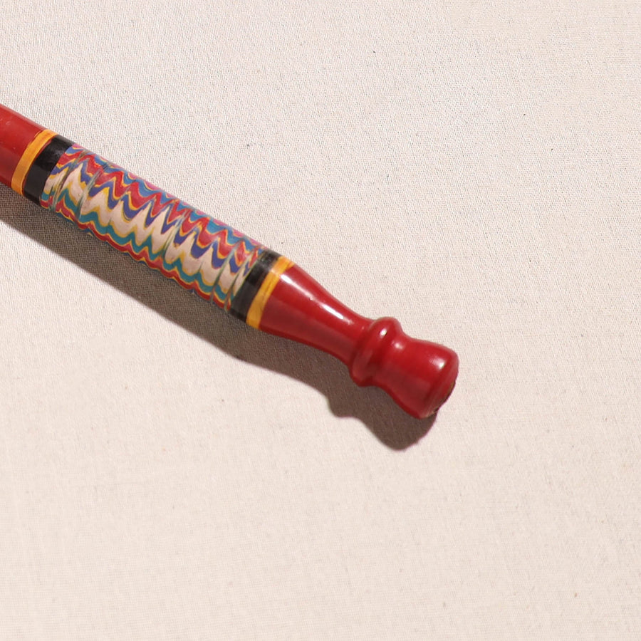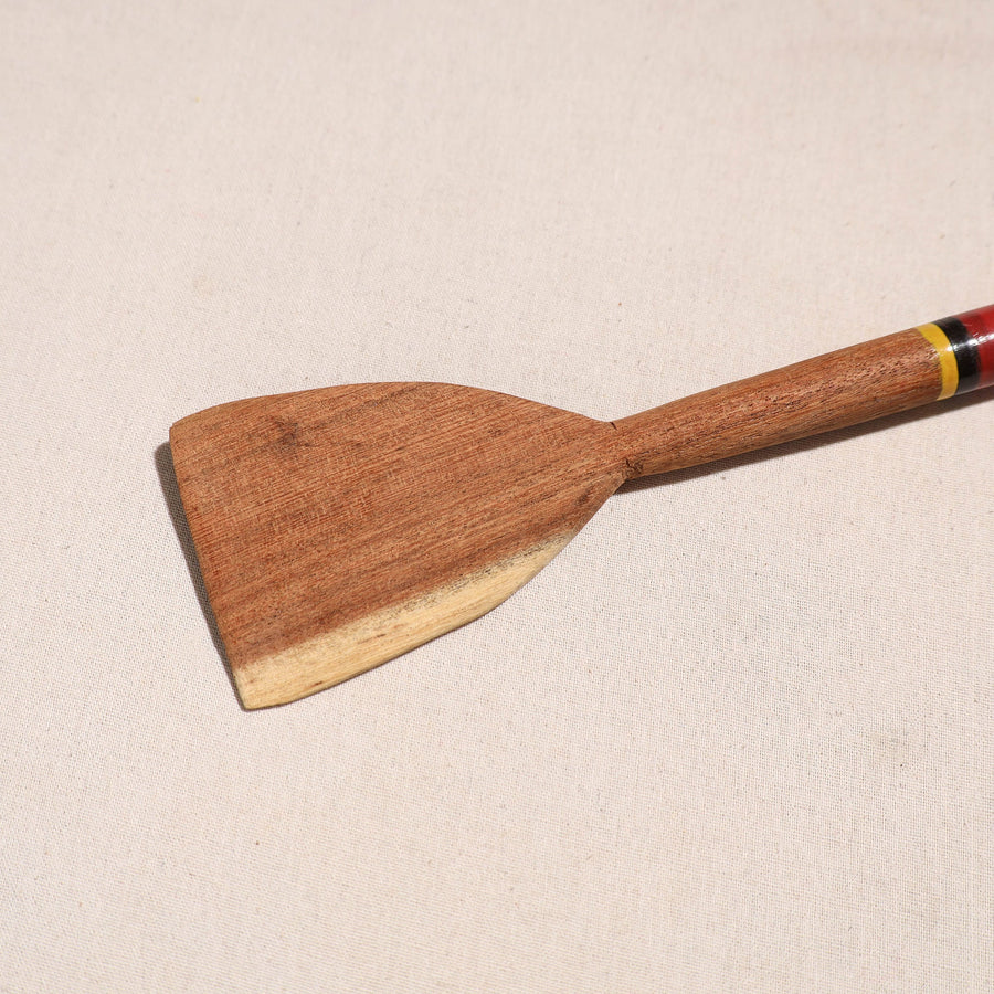 This handcrafted wooden spatula, is made of babool wood with lacquered colors. This spatula is meticulously handcrafted by skilled artisans from the Vadha community in villages like Nirona and Jura. They begin by selecting babool wood, which is known for its durability and strength. Layers of colored lacquer are applied to the wood, and intricate designs and effects are chiseled to create a stunning visual appeal.