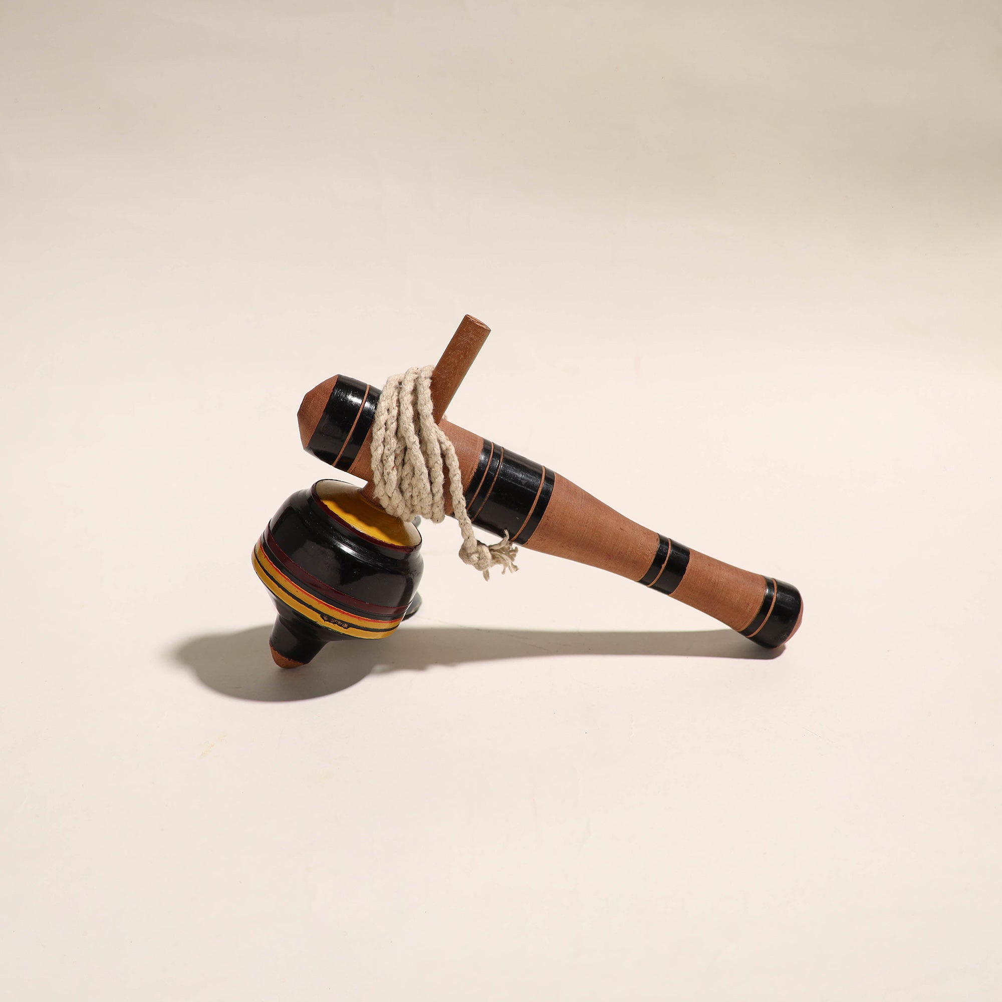 This handcrafted wooden spinning top, lattu, is made of babool wood with lacquered colors. This lattu is meticulously handcrafted by skilled artisans from the Vadha community in villages like Nirona and Jura. They begin by selecting babool wood, which is known for its durability and strength. Layers of colored lacquer are applied to the wood, and intricate designs and effects are chiseled to create a stunning visual appeal.