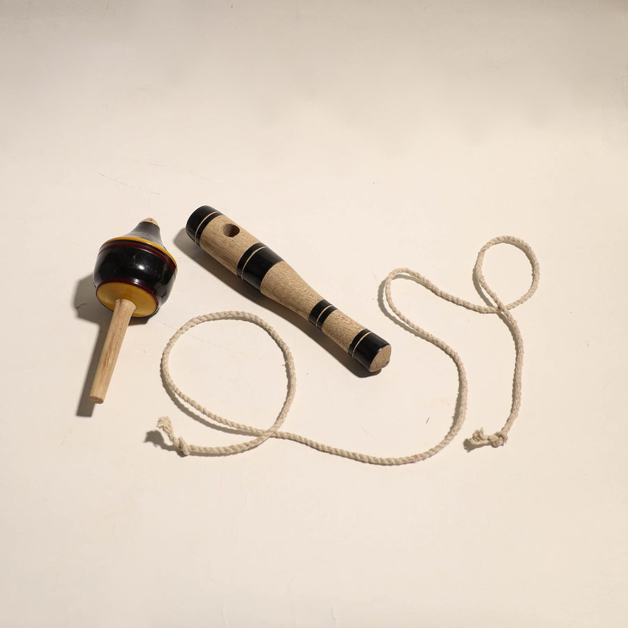 This handcrafted wooden spinning top, lattu, is made of babool wood with lacquered colors. This lattu is meticulously handcrafted by skilled artisans from the Vadha community in villages like Nirona and Jura. They begin by selecting babool wood, which is known for its durability and strength. Layers of colored lacquer are applied to the wood, and intricate designs and effects are chiseled to create a stunning visual appeal.