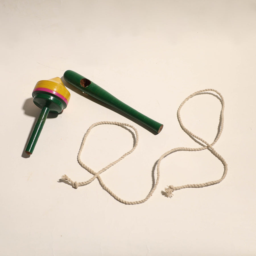 This handcrafted wooden spinning top, lattu, is made of babool wood with lacquered colors. This lattu is meticulously handcrafted by skilled artisans from the Vadha community in villages like Nirona and Jura. They begin by selecting babool wood, which is known for its durability and strength. Layers of colored lacquer are applied to the wood, and intricate designs and effects are chiseled to create a stunning visual appeal.