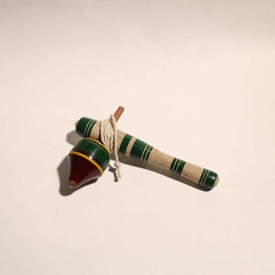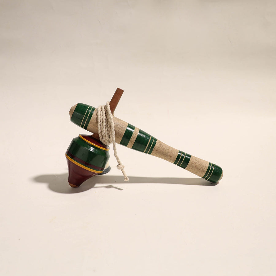 This handcrafted wooden spinning top, lattu, is made of babool wood with lacquered colors. This lattu is meticulously handcrafted by skilled artisans from the Vadha community in villages like Nirona and Jura. They begin by selecting babool wood, which is known for its durability and strength. Layers of colored lacquer are applied to the wood, and intricate designs and effects are chiseled to create a stunning visual appeal.