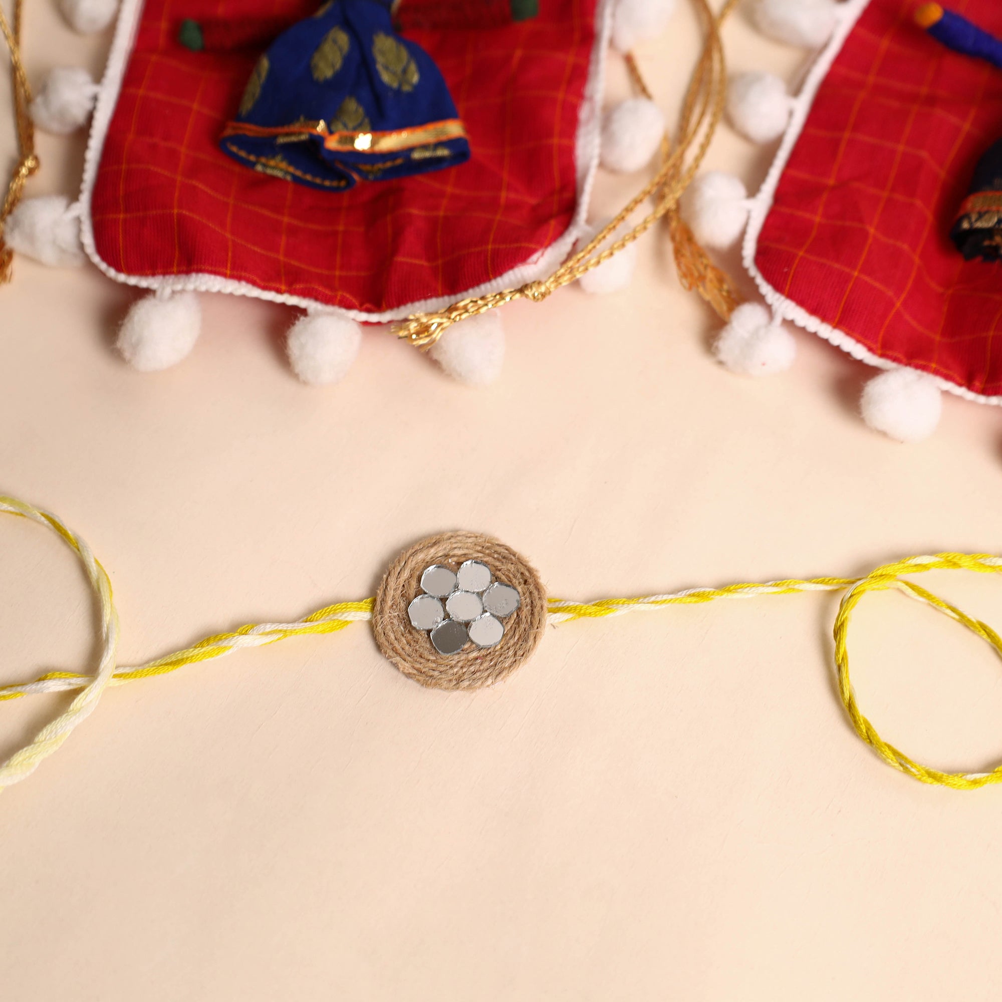 Celebrate the joyous festival of raksha bandhan with our exquisite handmade jute rakhi. Skillfully handcrafted with intricate mirror and stone work, this rakhi is a true symbol of love and affection between a brother and sister. It comes with a charming potli for an added festive touch.