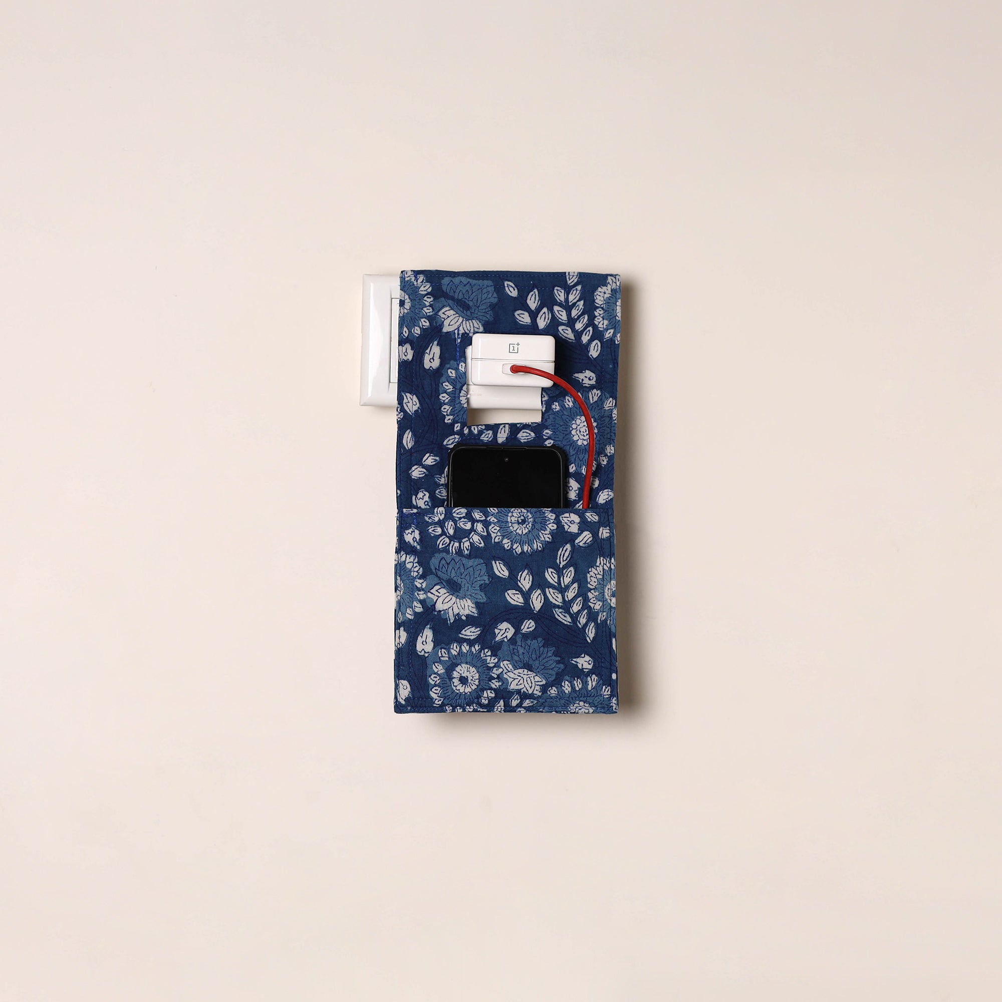 Handmade mobile charging holder is crafted from durable cotton fabric and features a convenient cut-out to hang directly on the plug. Designed with a deep front pocket, it securely holds your phone while charging. Created by artisans, it’s lightweight, foldable, fitting most phone sizes. A practical pick for home, office or travel use.