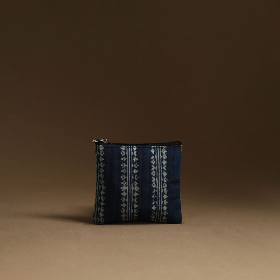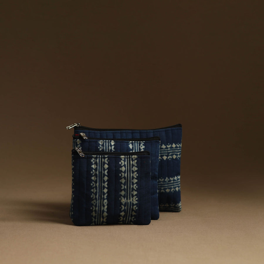 Organize your essentials with this blue handmade cotton multipurpose utility pouches (set of 3). Ideal for storing makeup, jewelry, medicines, or stationery, these pouches offer both functionality and style. Crafted with care by artisans, they feature a foam layer lining for added protection and a smooth zipper closure for easy access.