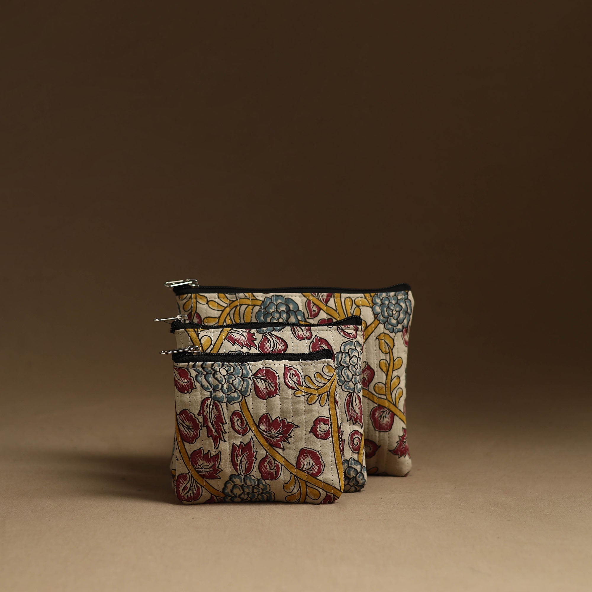 Organize your essentials with this beige handmade cotton multipurpose utility pouches (set of 3). Ideal for storing makeup, jewelry, medicines, or stationery, these pouches offer both functionality and style. Crafted with care by artisans, they feature a foam layer lining for added protection and a smooth zipper closure for easy access.