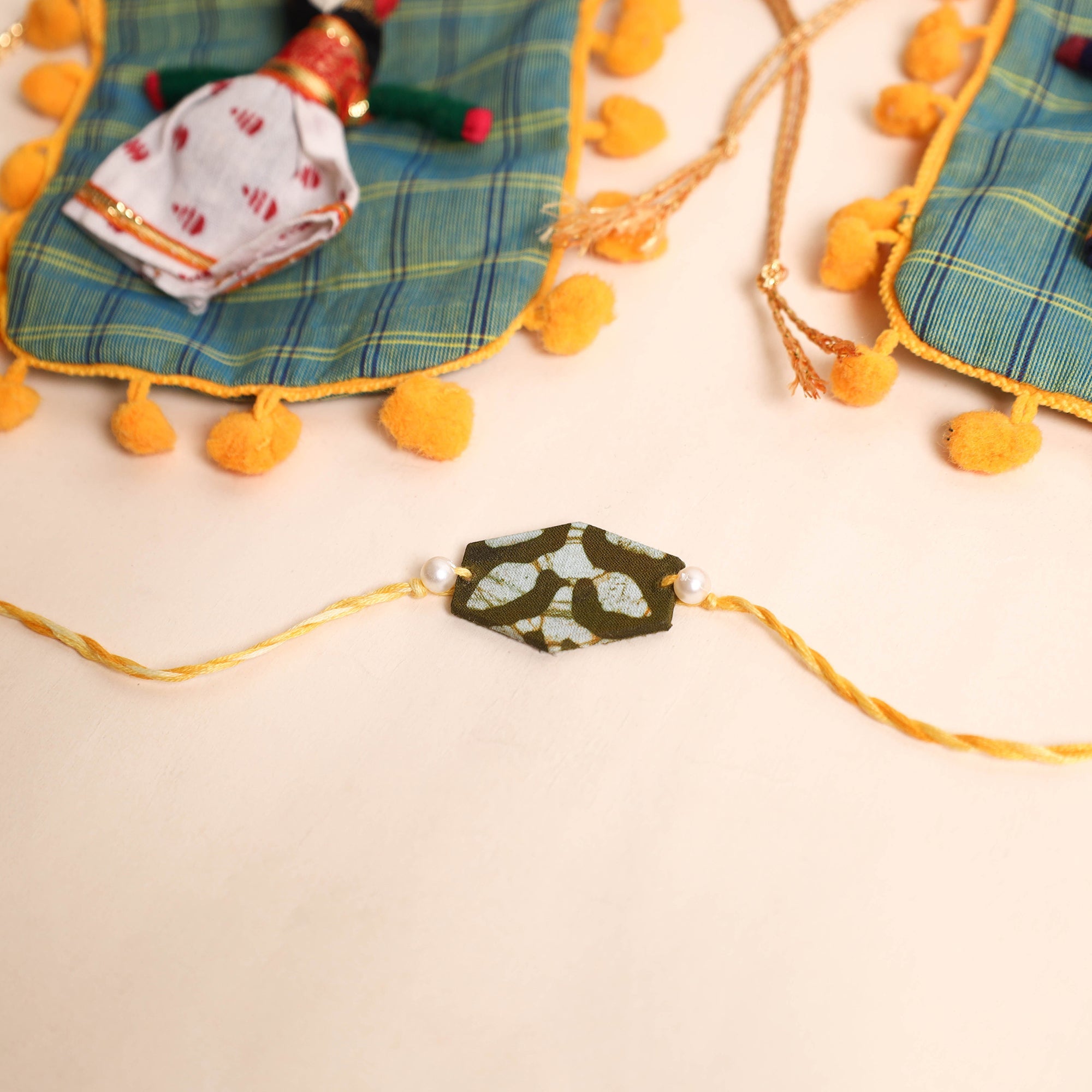 | Material Description | Celebrate the bond of love with this handmade pearl fabric Rakhi set. Featuring intricate patterns and vibrant colors, this Rakhi adds a special touch to your celebration. The set includes a potli, making it a perfect gifting choice. Whether for a sibling or a loved one, this Rakhi beautifully symbolizes care and tradition. By Purchasing Rakhi from iTokri you have proudly associated yourself with our artisan support initiative which brings happiness to more than 10000 families across India. Thanks so much! |