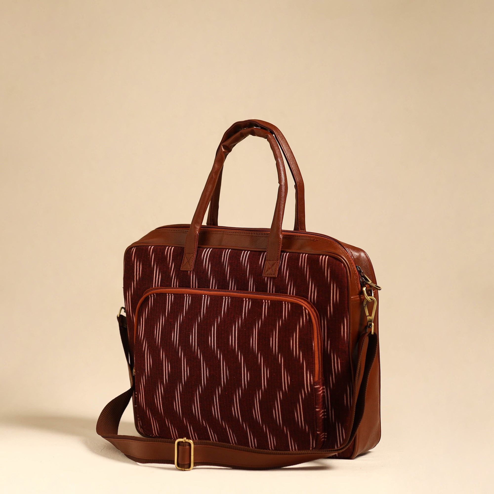 This handmade maroon pochampally ikat cotton laptop bag with an adjustable side strap and detachable sling is designed to protect and carry your laptop with ease and style. Crafted from durable artificial leather and adorned with pochampally Ikat cotton fabric, The interior boasts an eva sheet , ensuring optimal protection. With laptop compartment, two simple and one zipper pocket on the inside, and one zipper pocket outside, there is ample space to keep your laptop and other essentials organised. Embrace a perfect fusion of fashion and utility with this uniquely designed laptop bag.