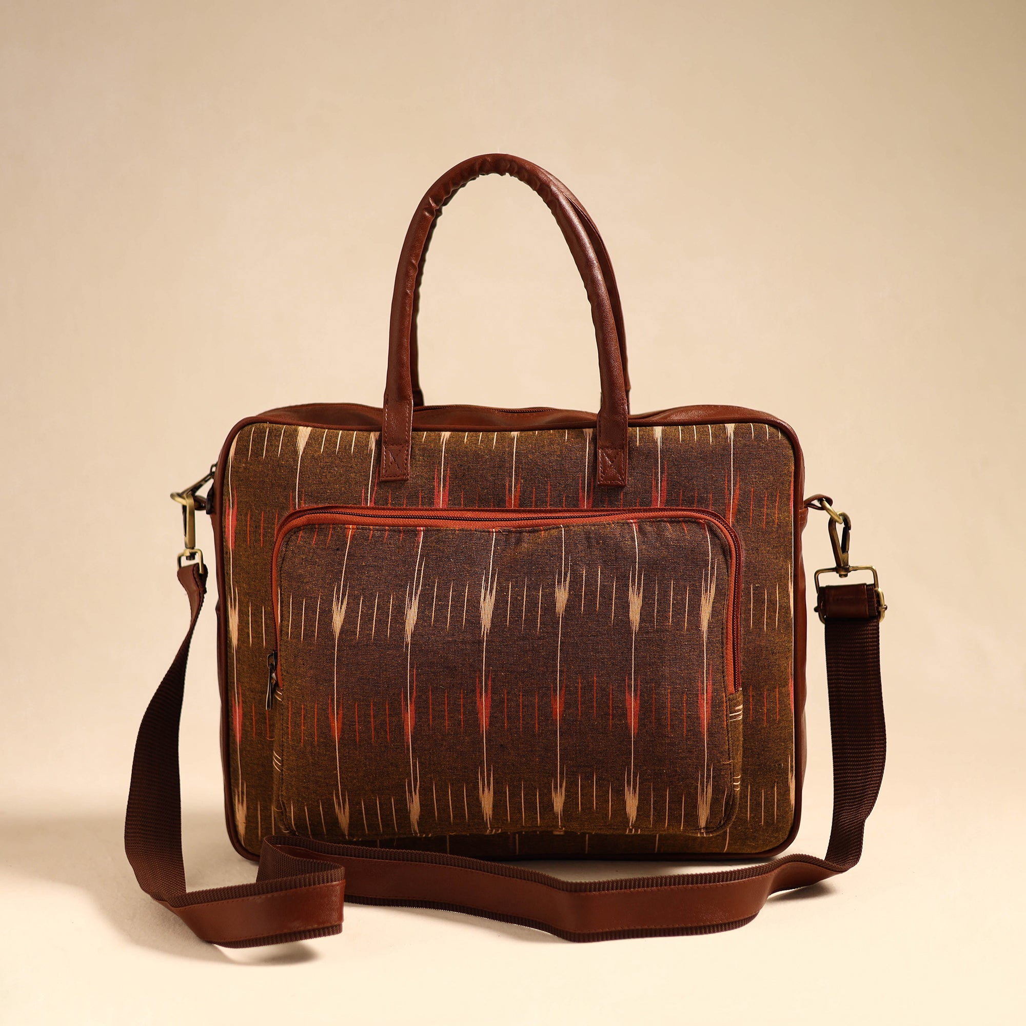 This brown handmade pochampally ikat cotton laptop bag with an adjustable side strap and detachable sling is designed to protect and carry your laptop with ease and style. Crafted from durable artificial leather and adorned with pochampally Ikat cotton fabric, The interior boasts an eva sheet, ensuring optimal protection. With laptop compartment, two simple and one zipper pocket on the inside, and one zipper pocket outside, there is ample space to keep your laptop and other essentials organised. Embrace a perfect fusion of fashion and utility with this uniquely designed laptop bag.