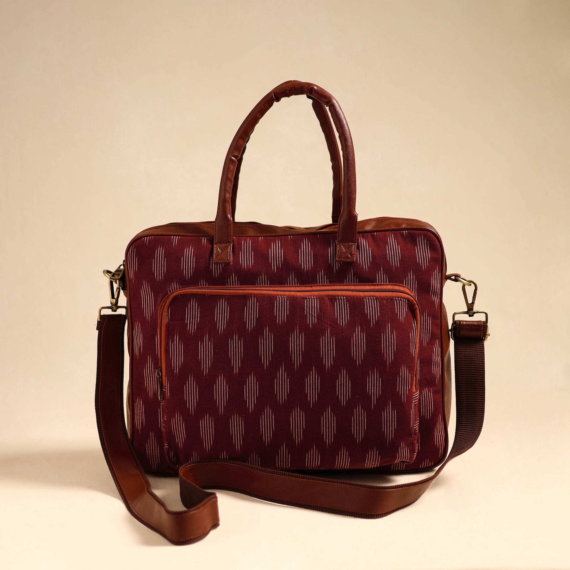 This maroon handmade pochampally ikat cotton laptop bag with an adjustable side strap and detachable sling is designed to protect and carry your laptop with ease and style. Crafted from durable artificial leather and adorned with pochampally Ikat cotton fabric, The interior boasts an eva sheet, ensuring optimal protection. With laptop compartment, two simple and one zipper pocket on the inside, and one zipper pocket outside, there is ample space to keep your laptop and other essentials organised. Embrace a perfect fusion of fashion and utility with this uniquely designed laptop bag.