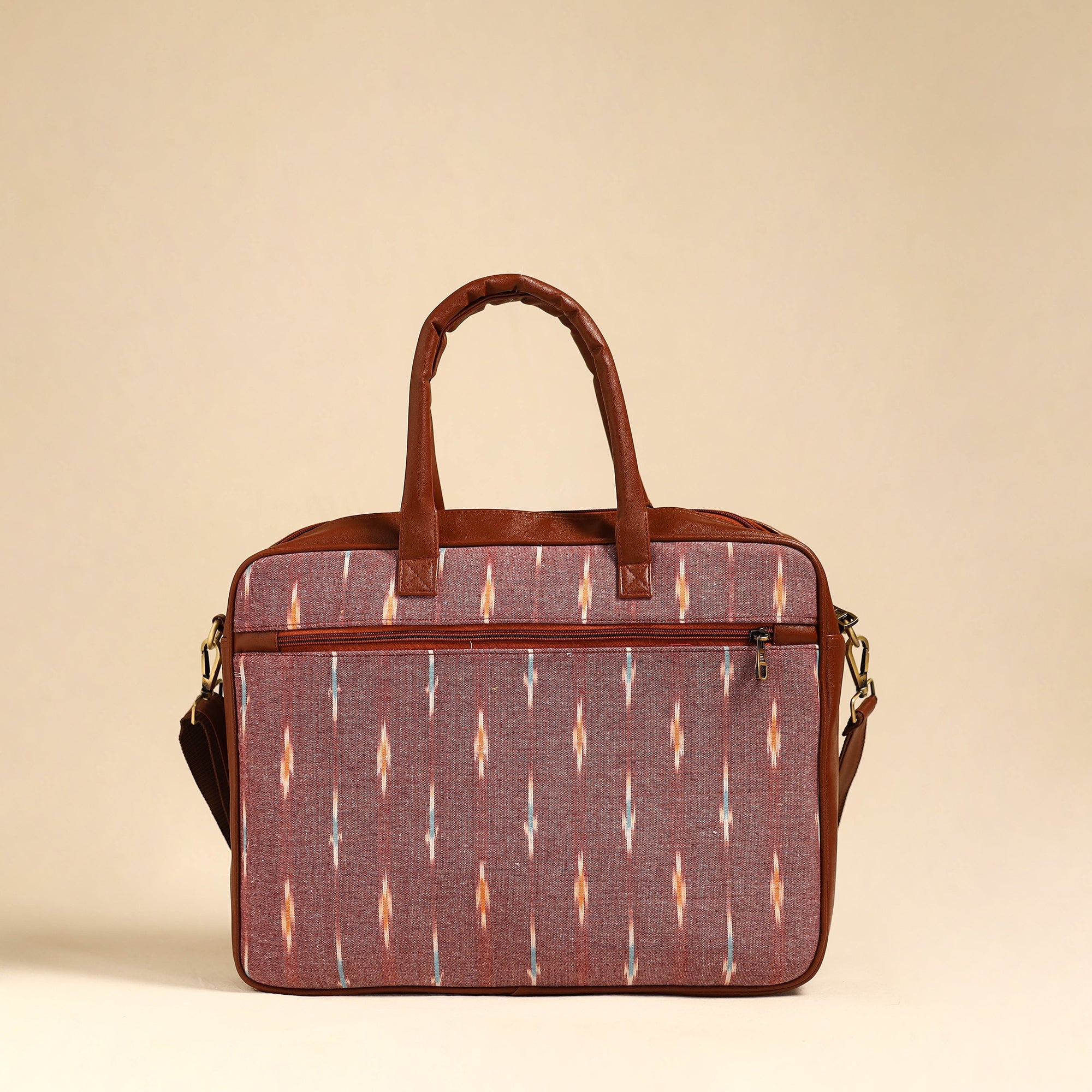This handmade brown pochampally ikat cotton laptop bag with an adjustable side strap and detachable sling is designed to protect and carry your laptop with ease and style. Crafted from durable artificial leather and adorned with pochampally Ikat cotton fabric, The interior boasts an eva sheet , ensuring optimal protection. With laptop compartment, two simple and one zipper pocket on the inside, and one zipper pocket outside, there is ample space to keep your laptop and other essentials organised. Embrace a perfect fusion of fashion and utility with this uniquely designed laptop bag.