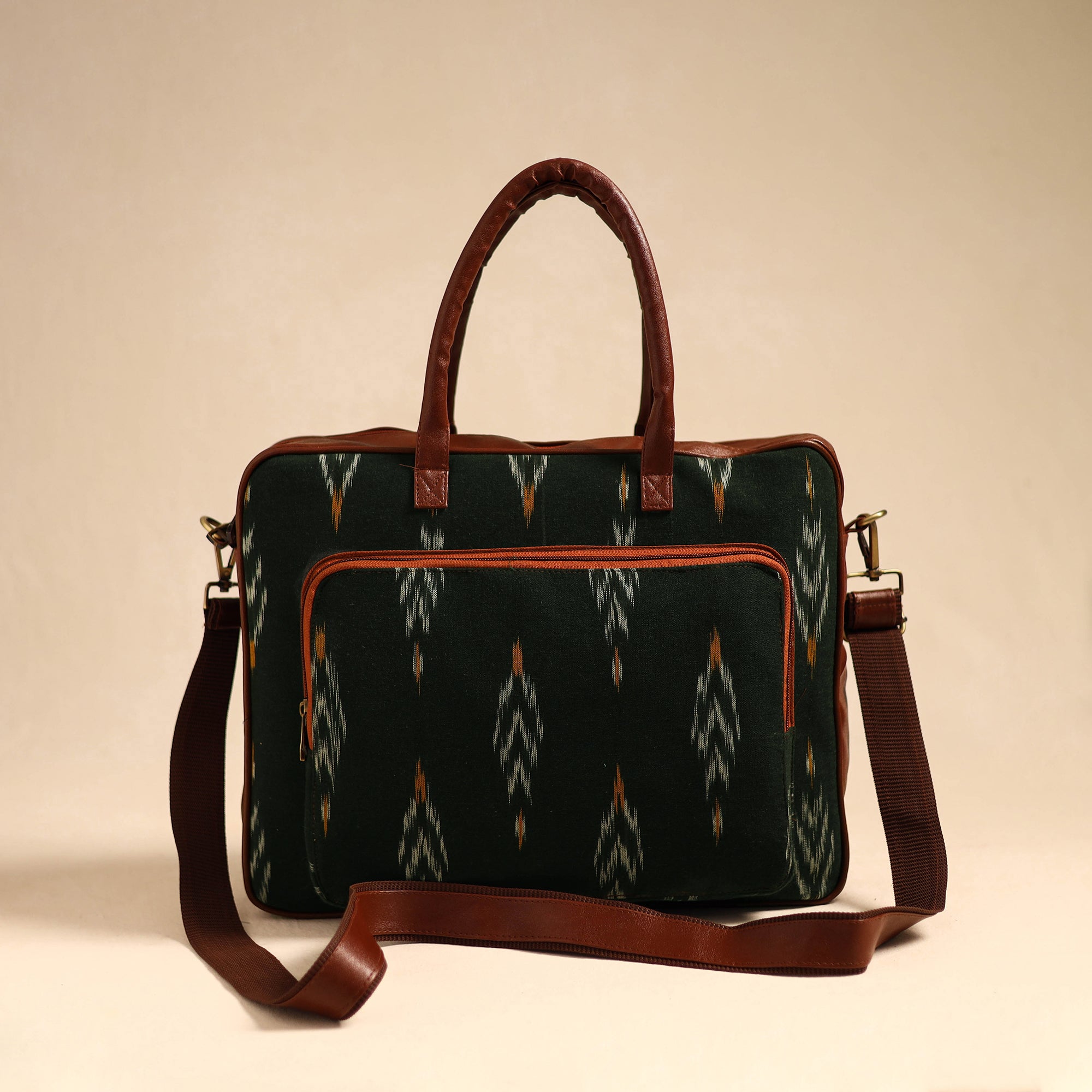 This black handmade pochampally ikat cotton laptop bag with an adjustable side strap and detachable sling is designed to protect and carry your laptop with ease and style. Crafted from durable artificial leather and adorned with pochampally Ikat cotton fabric, The interior boasts an eva sheet, ensuring optimal protection. With laptop compartment, two simple and one zipper pocket on the inside, and one zipper pocket outside, there is ample space to keep your laptop and other essentials organised. Embrace a perfect fusion of fashion and utility with this uniquely designed laptop bag.